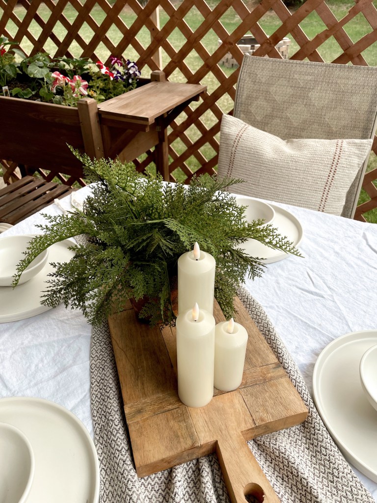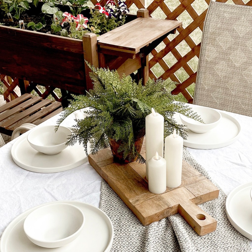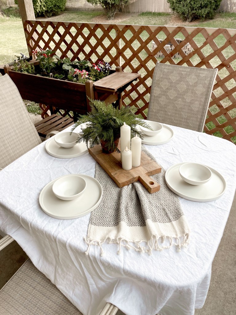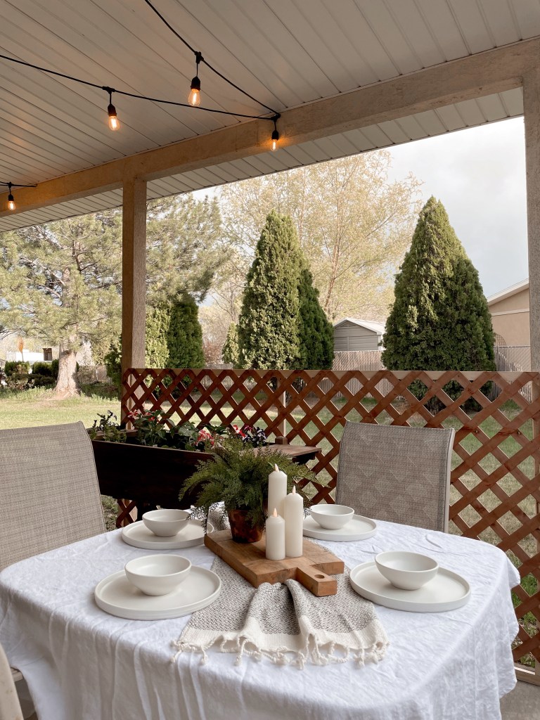 We have a very small outdoor space. But we still wanted a space to entertain, eat dinner outside and just hangout. With a little creativity we turned half of our carport into a fun, functional space. Complete with a cute little garden, a lattice privacy screen and some hanging lights. And of course a decorated table complete with candlelight.