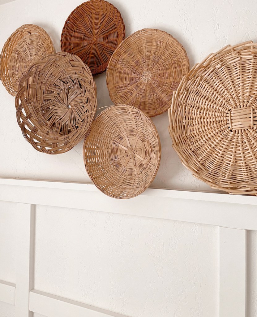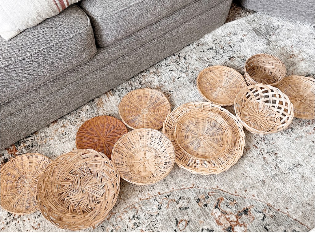 I started looking for baskets at thrift stores and online. I ended up finding my baskets online at Mercari. When creating a basket wall, I personally think it looks better and more uniform to stick with one shape. I wanted round baskets in varying sizes. The bundles I found available online had a couple different shapes but the majority were round.