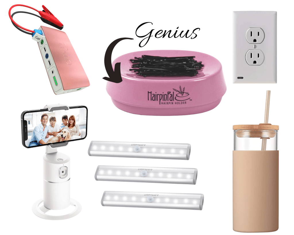A bobby pin holder? Are you kidding me? Genius!! These items may not have been on your wish list, but I’m guessing you’d like to get your hands on a few of these now. We can all use things to make life a little easier, am I right? A wall outlet with a built in nightlight, LED strip lights (perfect for under cabinets}, an auto tracking phone holder that tracks movement, a cool glass tumbler with a built in straw and bamboo lid and a laptop charger and car jump starter with AC outlet charger / car charger. All things I think I might need.