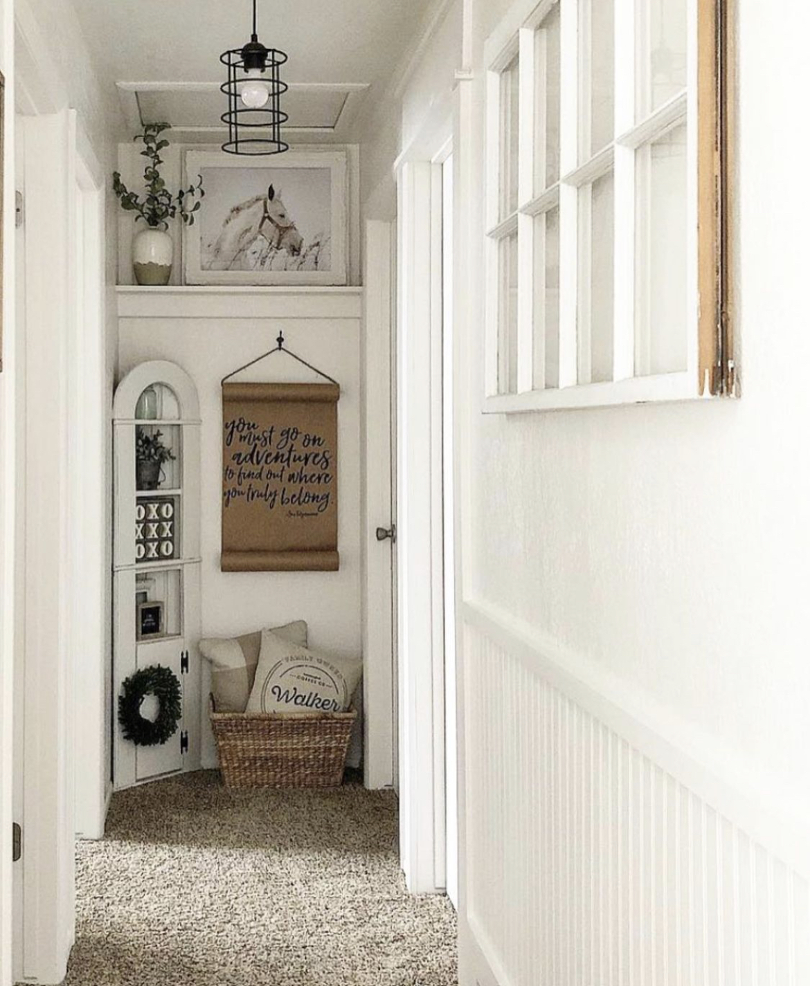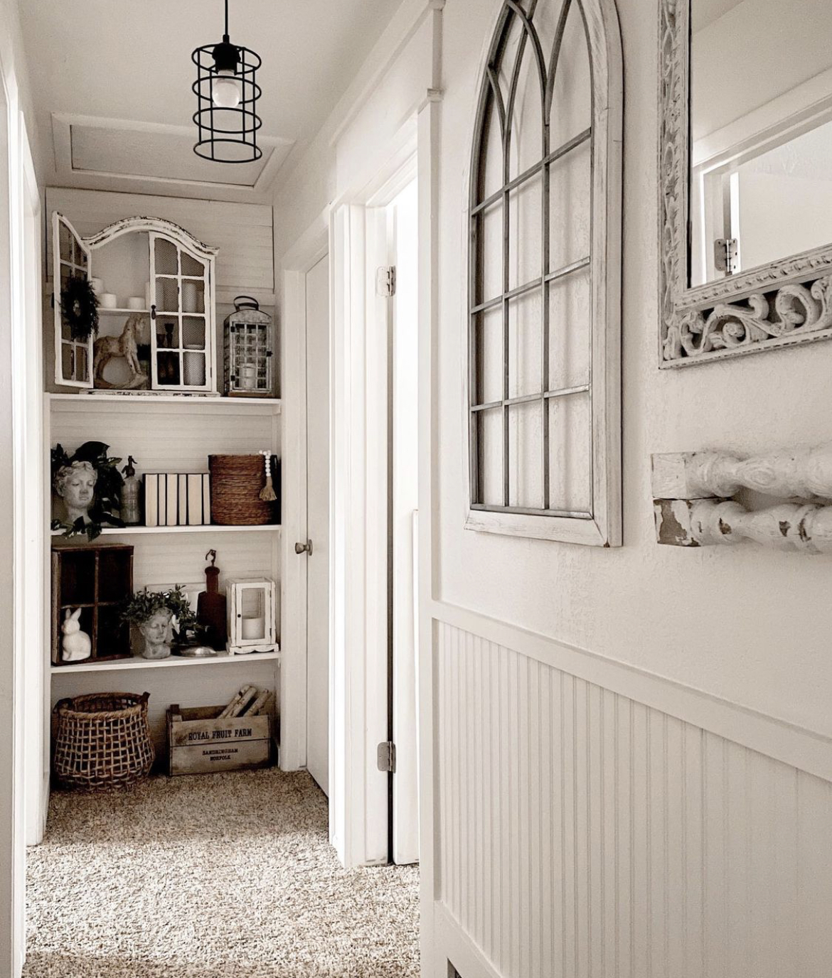 This space has seen a lot of changes over that last few years but the shelves have remained a constant. We also recently added shelves at the end of our hallway. It’s amazing how much they changed the look of this dead, useless space. Adding shelving is a great way to utilize a space that currently serves no purpose. I wanted the shelves in my hallway to look built in. I added beadboard to the back wall and then I created ledges for the shelves to sit on by using 1 x 2’s that I fastened to the beadboard wall and both sidewalls. Then I used 1 x 10 pine boards for the shelves. P.s. If you want adjustable shelves this method wouldn’t work. Check out the before and after below to see the difference the shelving makes.