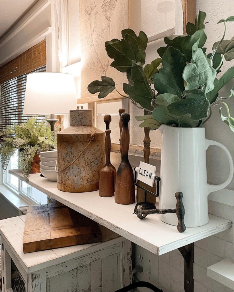 Another thing to remember is to keep your color scheme cohesive. I even try to keep the different wood tones similar. You want everything on that shelf to look like it’s right at home. A few key items I always use are candles, greenery and dishes (in the kitchen.) It’s also a good idea to stand back often to get a better look at your progress. I never nail it on my first try. In fact, because I’m OCD, it takes me several attempts to get my shelves styled to perfection. But practice makes perfect, right?