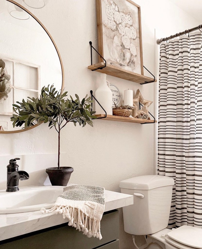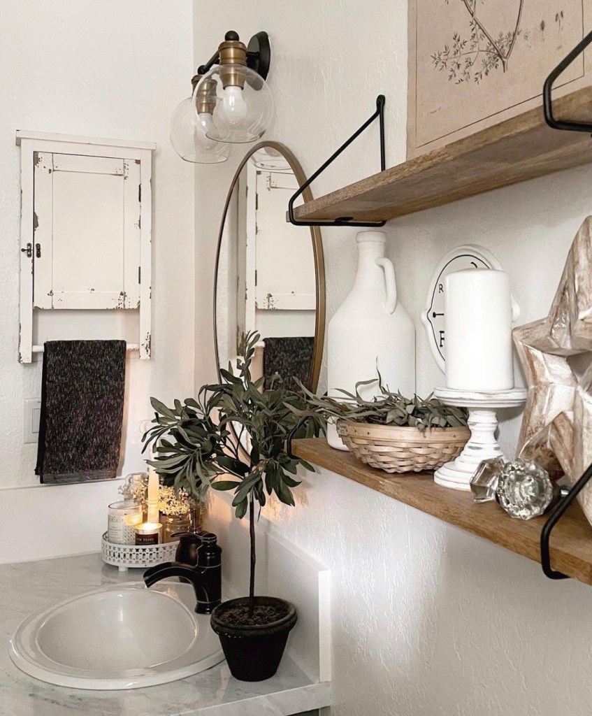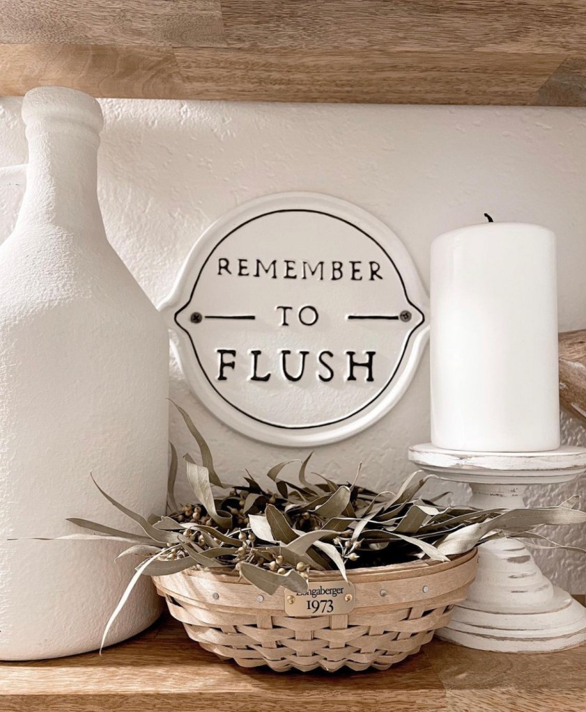 If there is one thing in my house that gets rearranged often, it’s shelves. They are my favorite thing to style. But I know they can also be intimidating. When I style shelves, I like them to look full without looking cluttered. I have shelves in almost every room in my house. The key to styling them is to pick items that fit that particular room. I like to start with a clean slate and gather the items I want to use so that they are handy to grab. One thing to remember…you want varying heights. For my bathroom shelves I started with this cute sign from Target and worked around that. Leaving the top shelf to lean a piece of wall art on. Simple but effective.