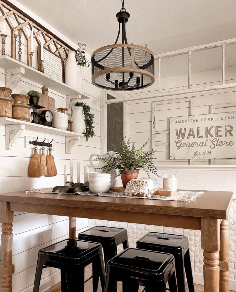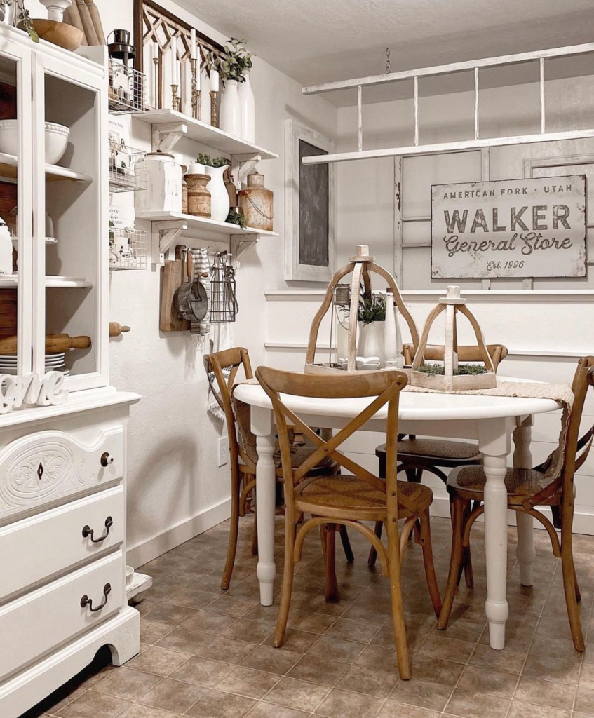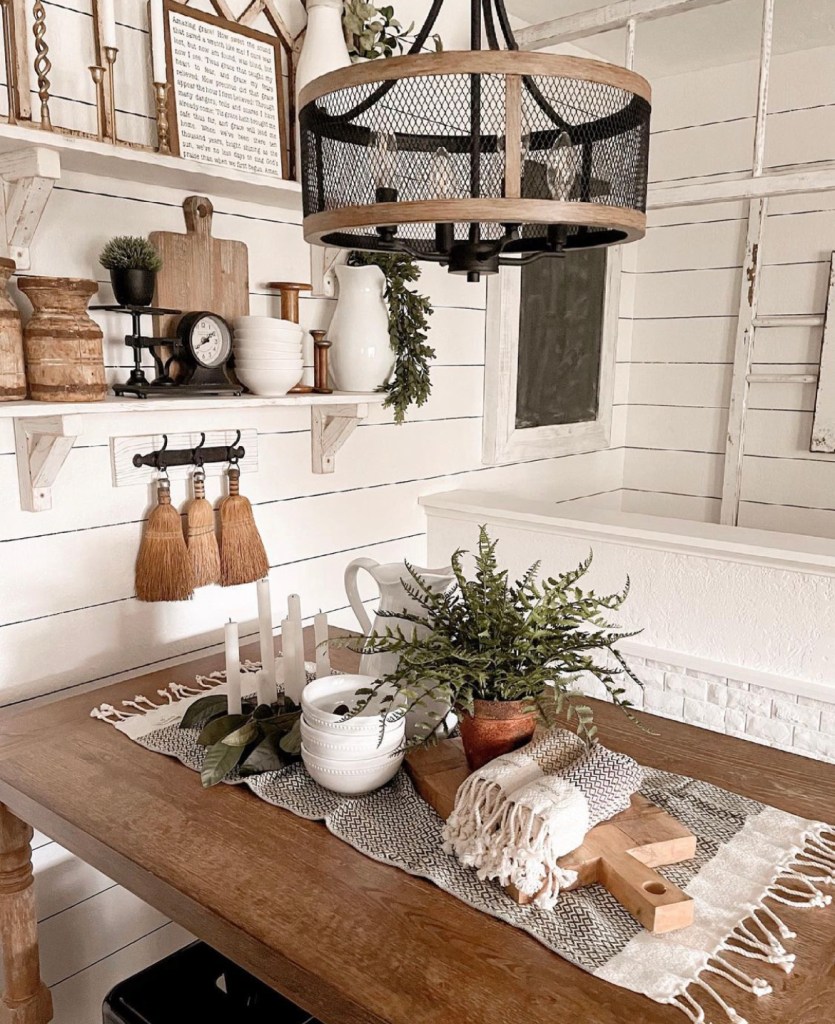 Open shelving is a fun way to display decor and dishes. But they can easily look cluttered and messy. I try to style items on my shelves that blend together nicely and create a cohesive look. Like white dishes, small plants and vintage decor items. Baskets are also a great way to store items while still keeping your shelves organized and clutter free. The shelves in our eat-in kitchen area are mostly for decorative items. But I still keep items on them that look like they belong with the theme in the rest of kitchen. For these shelves we used 1 x 8 pine boards from Home Depot. The brackets were made using 2 x 2’s.