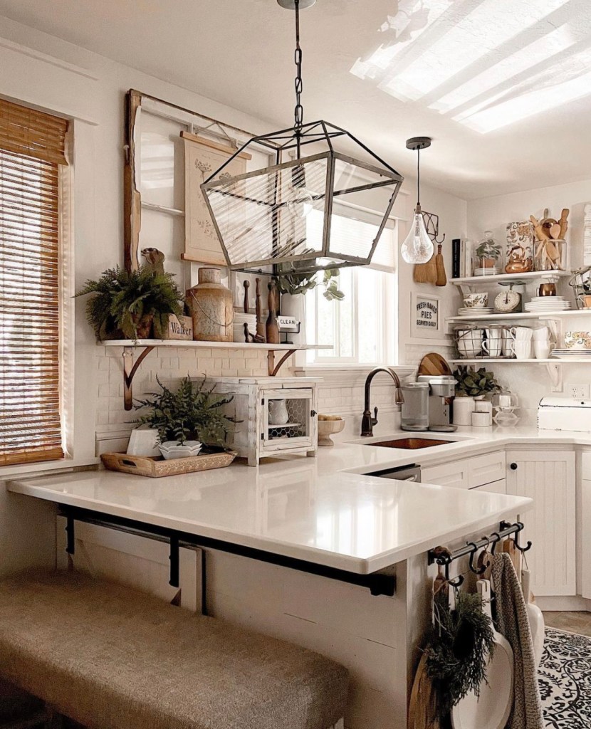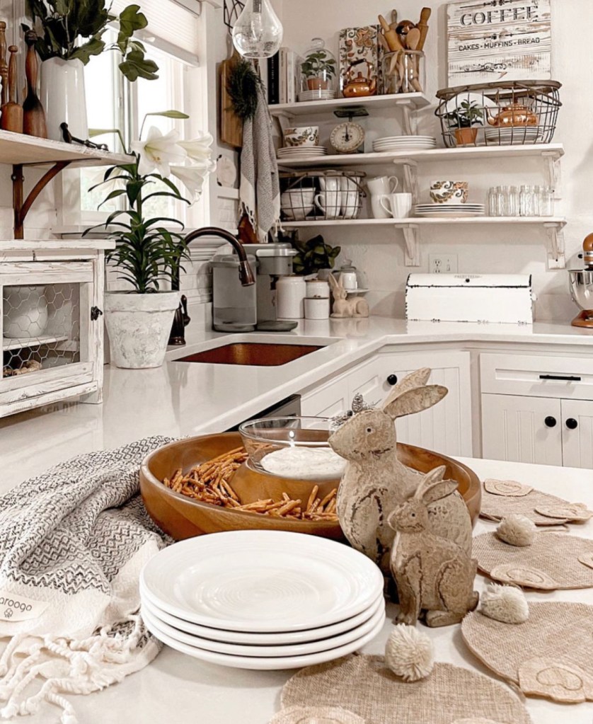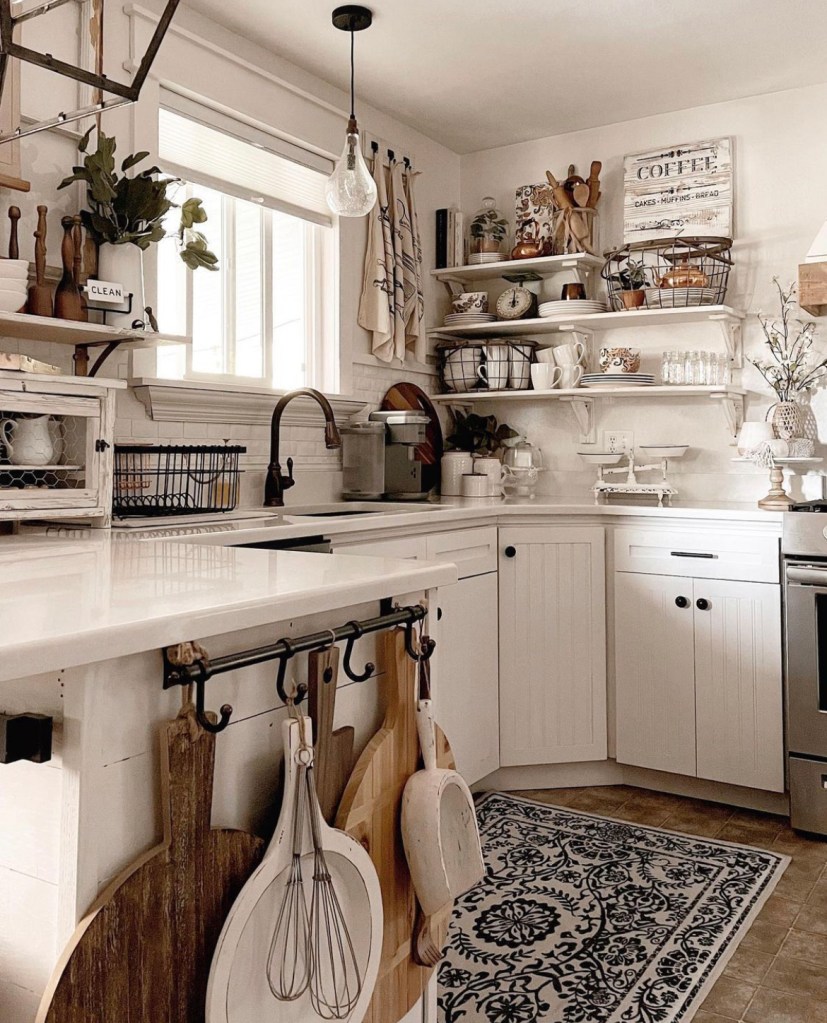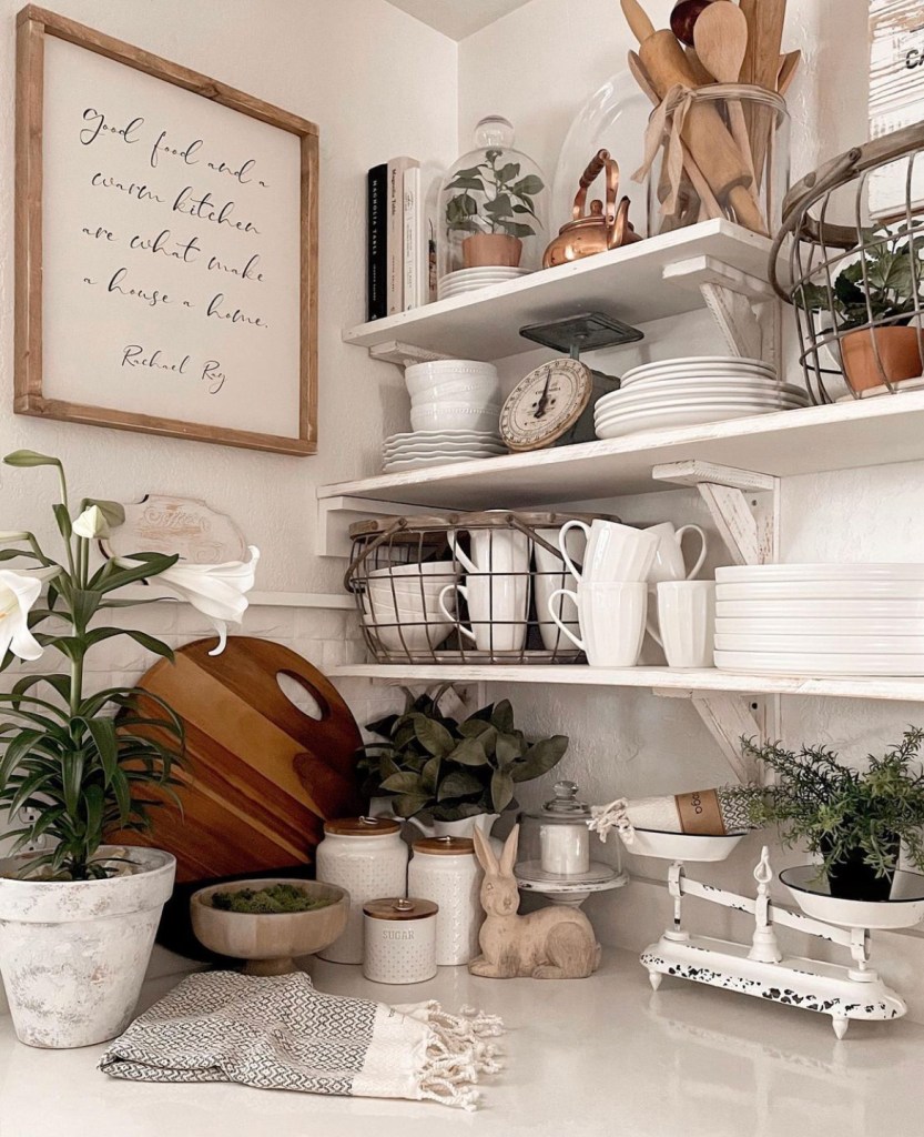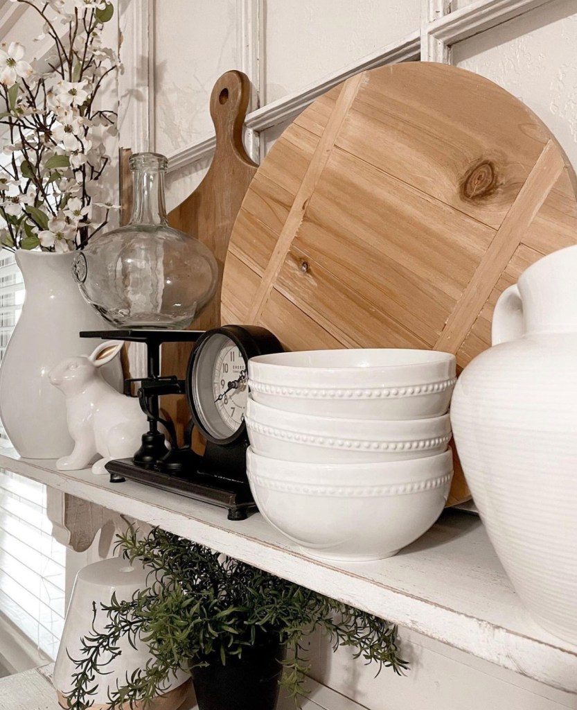 I replaced all of my upper cabinets in my kitchen with open shelving. Some of the shelves are multifunctional while others just hold decorative items. I get asked a lot if it’s hard to keep them clean. I also hear “Pretty, but major dust collectors.” Do they require a little more attention? Yes. But I love rearranging my shelves. So keeping them clean is not that hard. For example, the shelves that house items we use everyday get switched out often with clean dishes. The others I rearrange or clean about twice a month or more. When styling kitchen shelves with items you use, make sure the shelf is easily within reach. I store our everyday kitchen items on the bottom shelf. Like coffee mugs, glassware and plates. One thing to keep in mind if you’re wanting to add open shelving in your kitchen is the amount of weight they will hold. My shelves hold a lot of weight so we were sure to hit studs or use drywall anchors when we added the brackets. Almost all of the shelving in our home was made by us. We love DIY’s. The shelving in my kitchen is made up of 1 inch thick plywood sheets that we cut down (Home Depot will do this for you as long as your cuts are 12″ or more.) The brackets we used were made by my husband using 1 x 3 pieces of pine board from Home Depot.