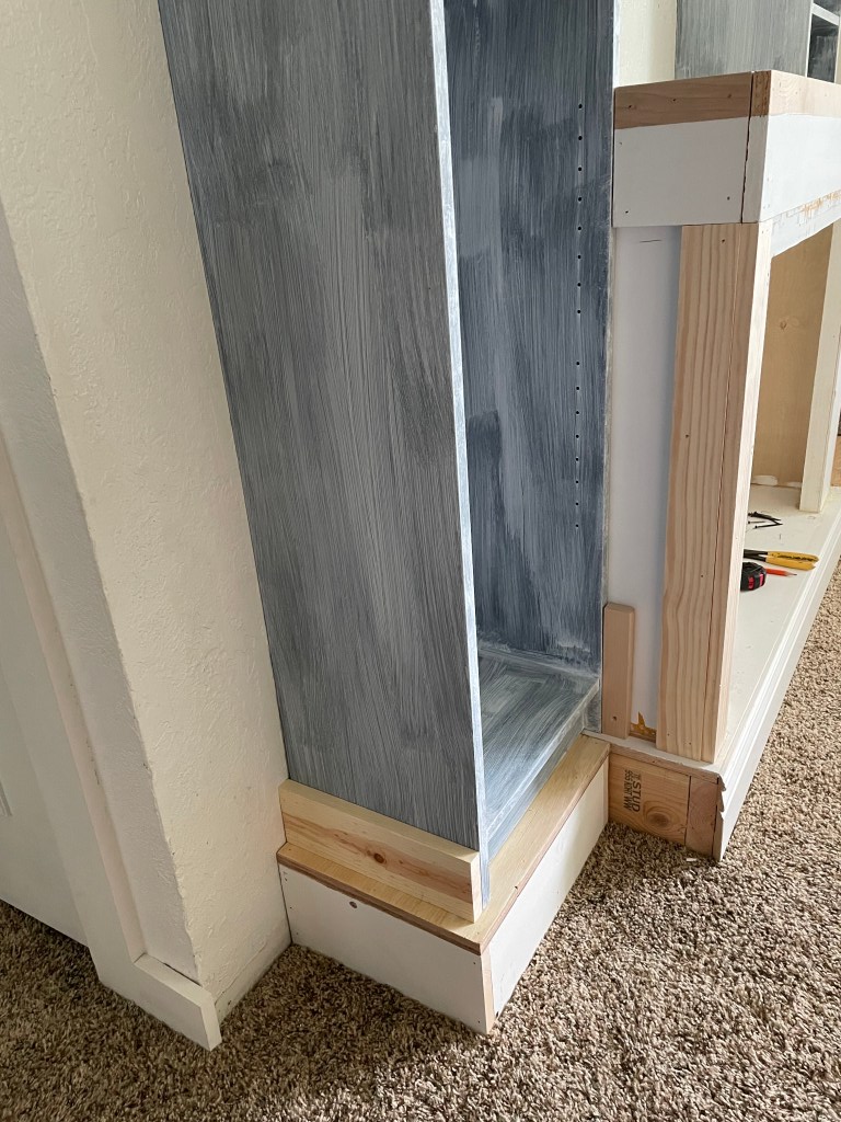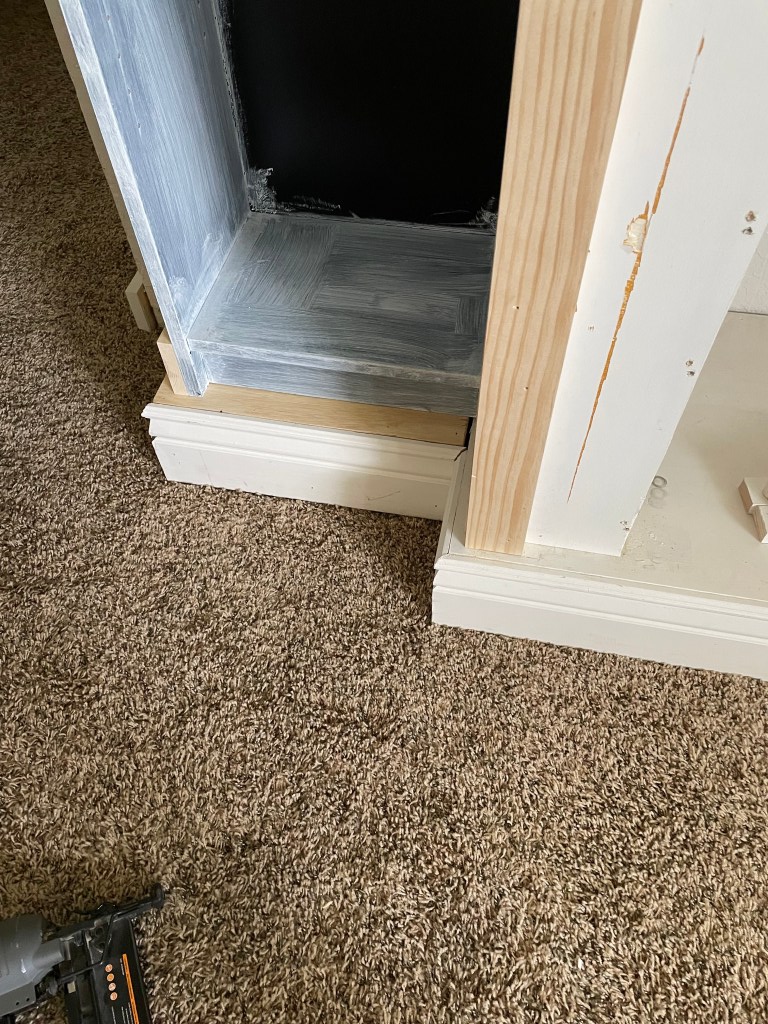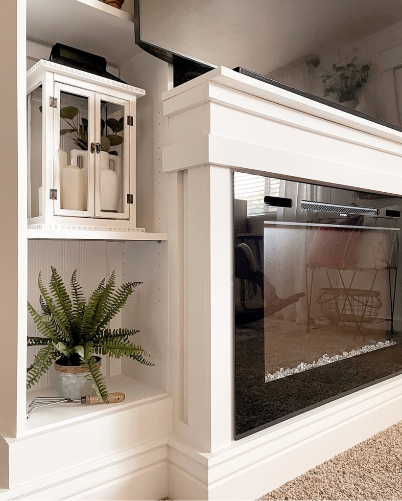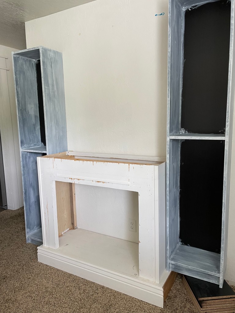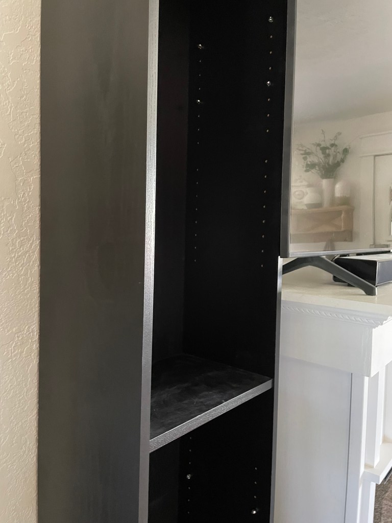 I love the look of custom built in wall units. I started researching tips on how to make my own and realized that many of the tutorials I found used Ikea hacks. Mainly using the Billy bookcase. I went to Ikea and unfortunately they were sold out. I was looking for the tall, skinny ones. They were also sold out online. So I searched Facebook Marketplace. I found someone selling 2 (exactly what I was needing) and get this…they live 5 minutes from me. And the best part? They were already assembled. Score!! I didn’t even care that they were black since I was going to be painting them anyway. I lightly sanded them and then added a coat of primer. I used this primer https://amzn.to/3wUgSfA I wasn’t worried about the back inside because I planned on adding wainscoting there. We already had the faux fireplace that my hubby built. That tutorial for that is here https://www.instagram.com/stories/highlights/18072214471191087/ Because I wanted the whole thing to look like one piece, I had to remove the moulding on the faux fireplace, as well as the top. I then had my husband cut the whole piece down about 5 inches.