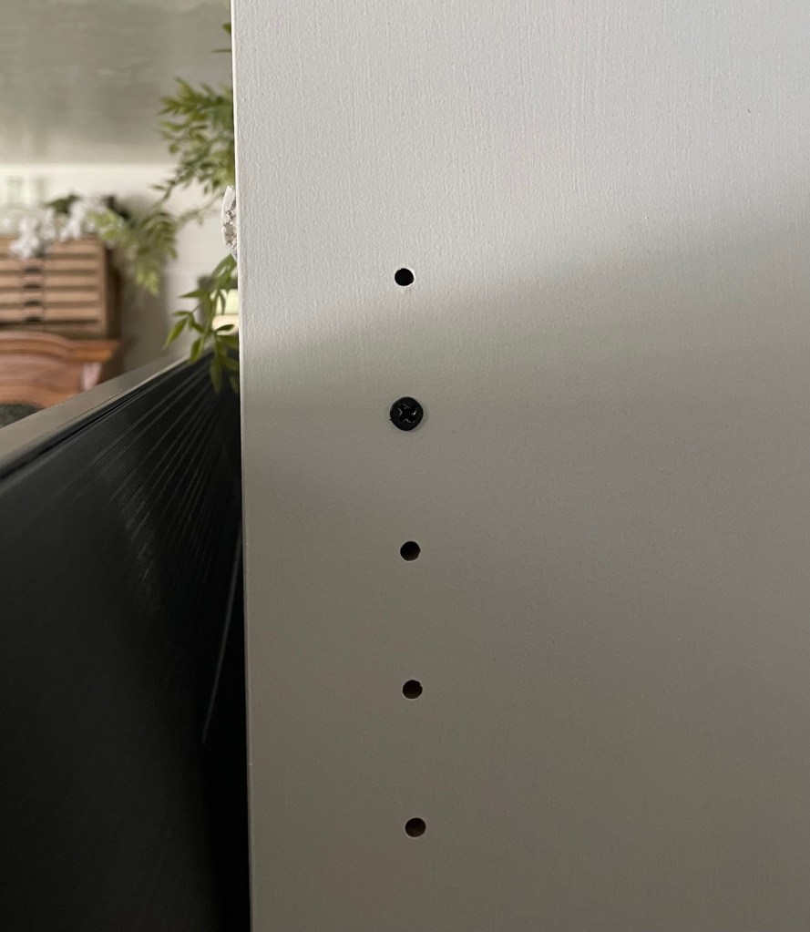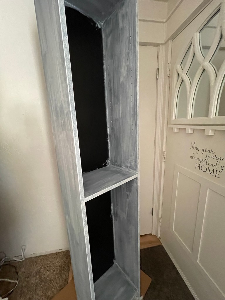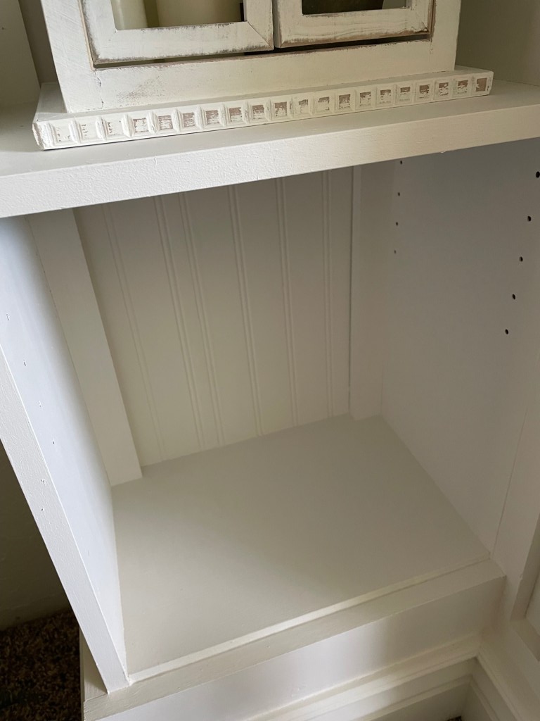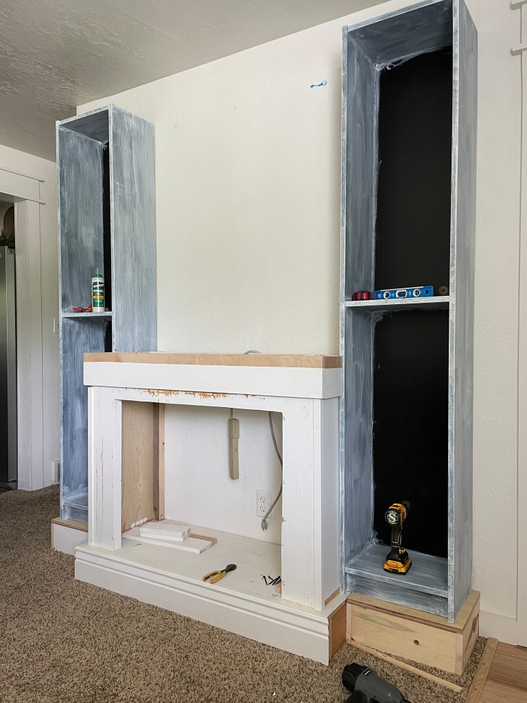 I love the look of custom built in wall units. I started researching tips on how to make my own and realized that many of the tutorials I found used Ikea hacks. Mainly using the Billy bookcase. I went to Ikea and unfortunately they were sold out. I was looking for the tall, skinny ones. They were also sold out online. So I searched Facebook Marketplace. I found someone selling 2 (exactly what I was needing) and get this…they live 5 minutes from me. And the best part? They were already assembled. Score!! I didn’t even care that they were black since I was going to be painting them anyway. I lightly sanded them and then added a coat of primer. I used this primer https://amzn.to/3wUgSfA I wasn’t worried about the back inside because I planned on adding wainscoting there. We already had the faux fireplace that my hubby built. That tutorial for that is here https://www.instagram.com/stories/highlights/18072214471191087/ Because I wanted the whole thing to look like one piece, I had to remove the moulding on the faux fireplace, as well as the top. I then had my husband cut the whole piece down about 5 inches.