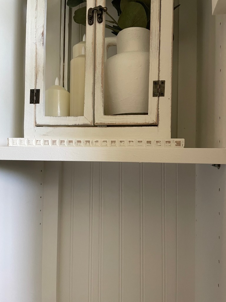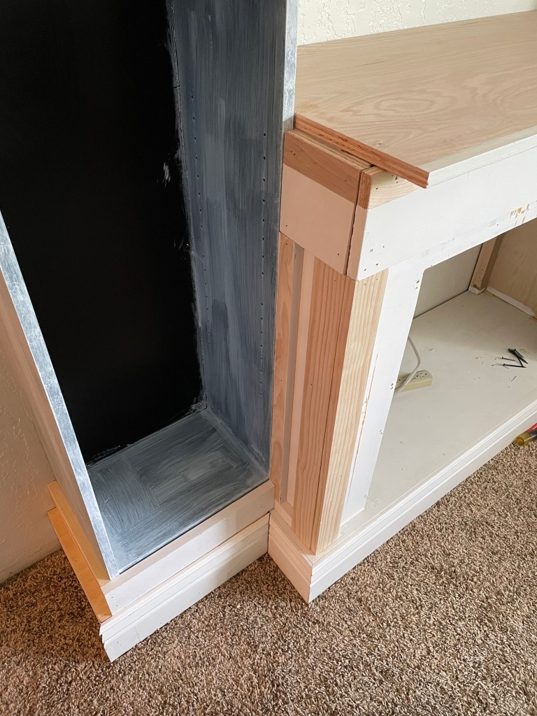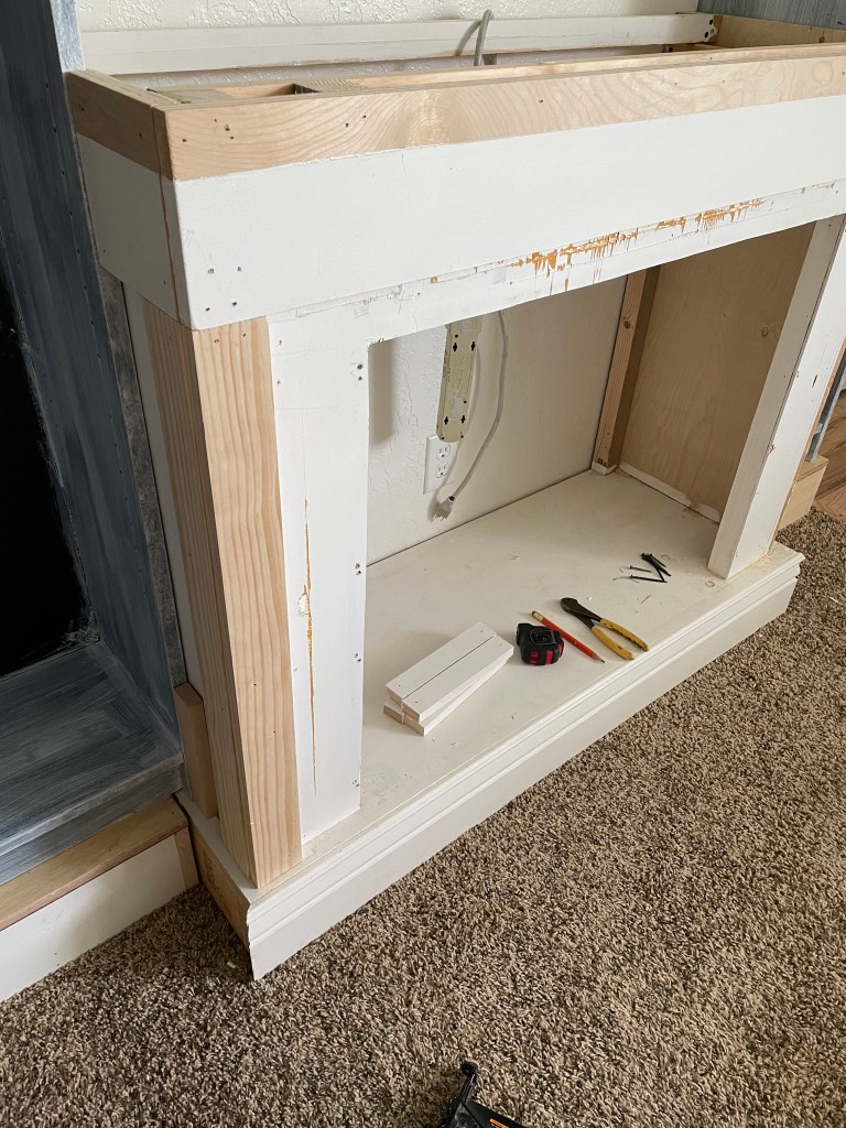 I ended up adding some additional pieces of moulding around the top using 1 x 2 premium select pine from Home Depot. And also spliced in a couple pieces on the top. When we cut the top we didn’t account for overhang on the sides and so it didn’t look quite right (DIY fail.) I will be filling in nail holes and gaps with nail hole filler. My favorite nail hole filler is found here https://amzn.to/3gd2loC It’s seriously every DIYer’s best friend (or at least mine.)