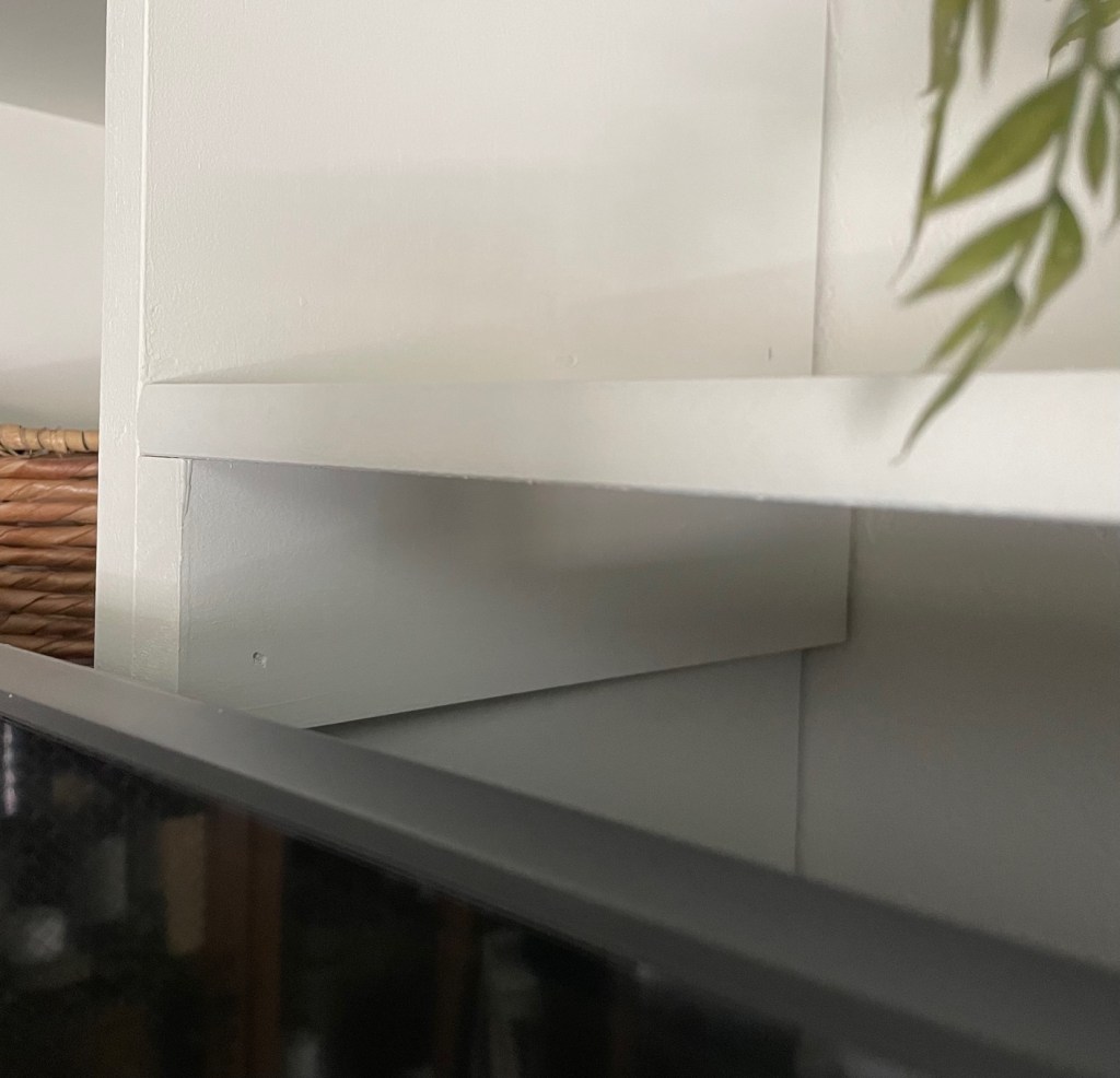 For the shelf above the TV I used a 1/2″ thick x 11 3/4″ deep piece of bullnose shelving from Home Depot. I fastened a piece of 1 x 2 on each bookcase for the shelf to sit on. I used the existing holes for the bookcase shelves to screw the pieces of 1 x 2 in.