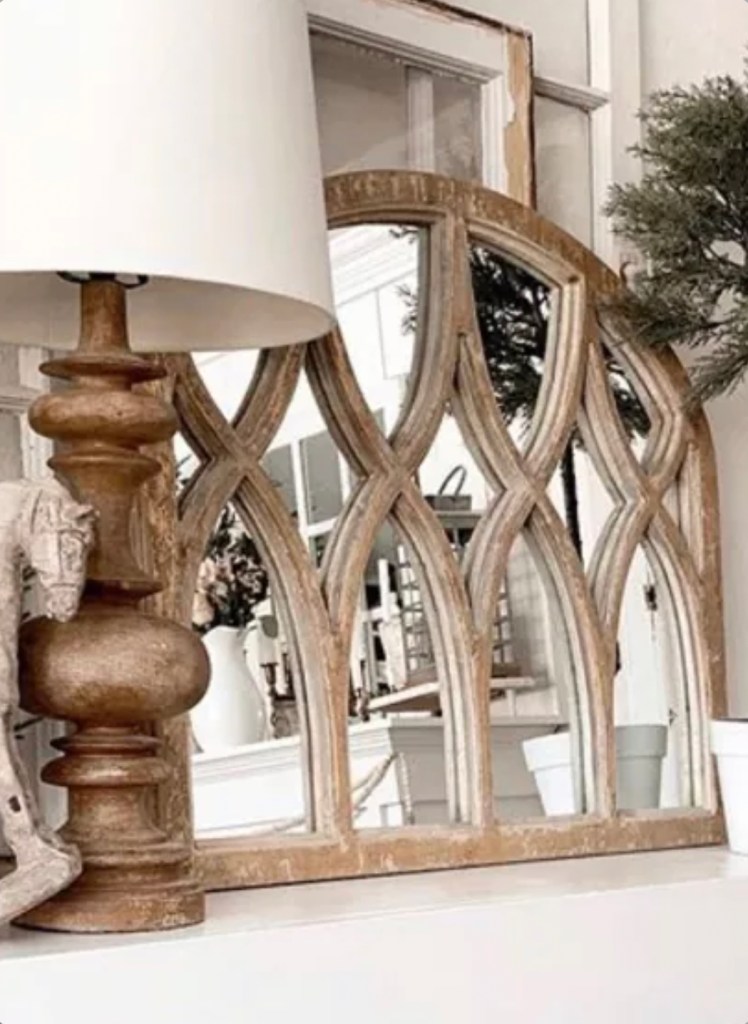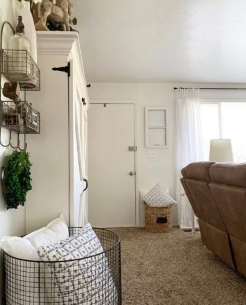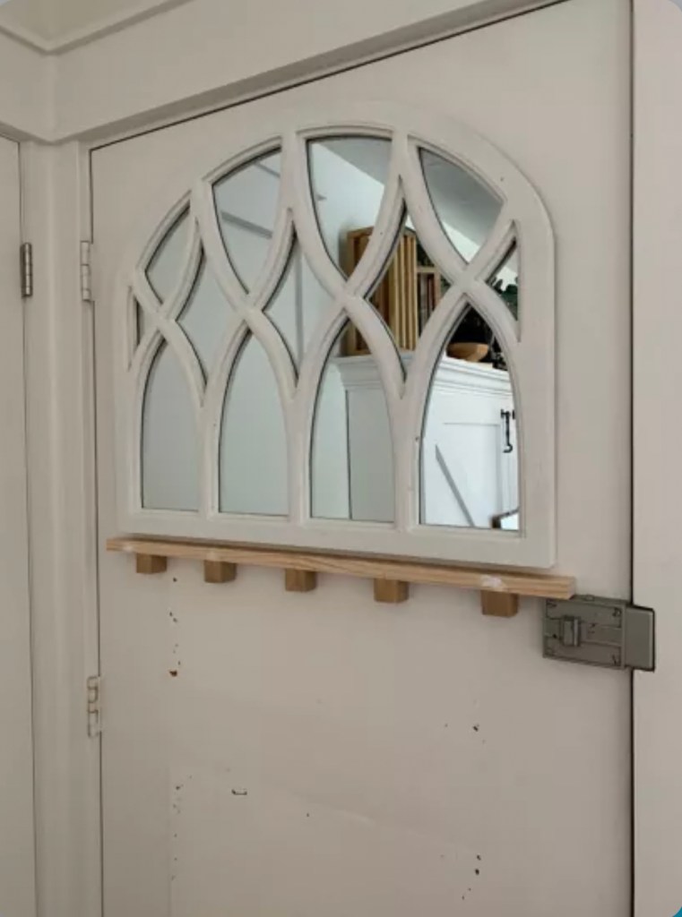 The door still needed something. A window? Well that’s not going to happen. But what about an arched mirror that mimics a window? I just happened to have a cute mirror that would work perfectly. I got it cleaned up, removed the backing and the mirror and painted the frame. After I got it put all back together, I positioned it on the door and marked where I needed the screws. I was concerned about how well the mirror would stay secured with the door getting opened and shut all the time, but it has not been a problem at all. It’s hung just using the existing D-ring hooks on the back.