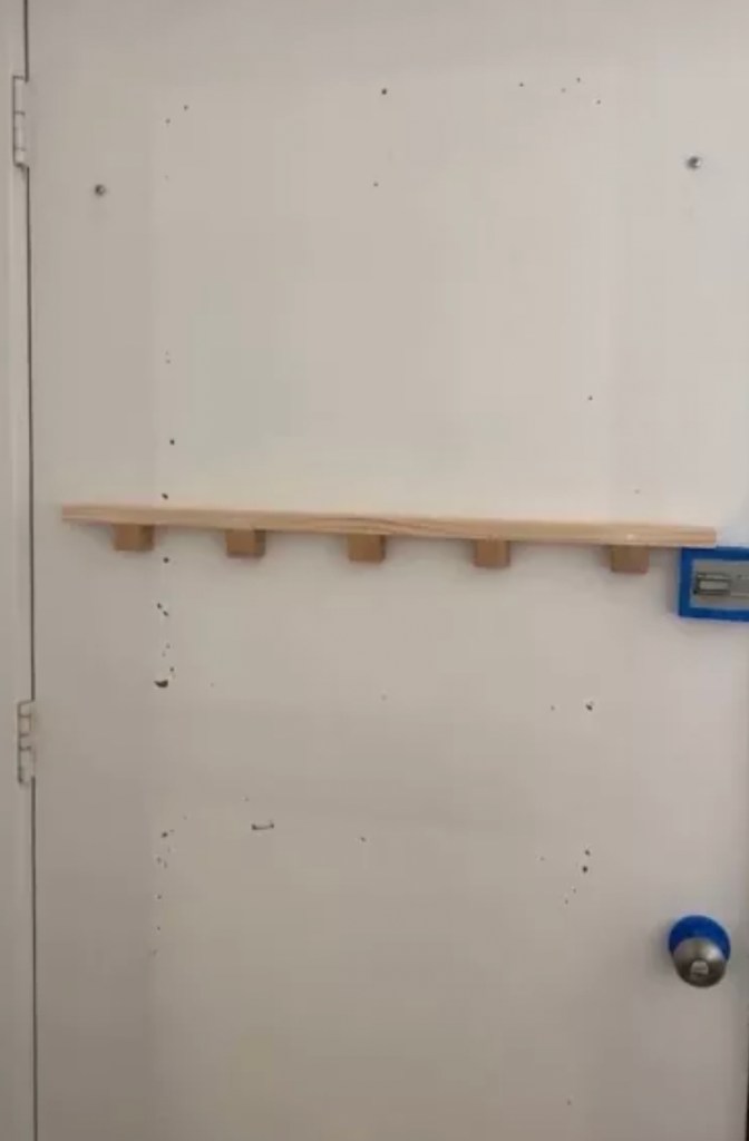 I am obsessed with dentil shelves and decided my door definitely needed one. Keep in mind this project had to cost as little as possible. So I went rummaging through all of my scrap pieces of wood and found a 2 x 2. I cut one piece for the “shelf” and then cut a few small pieces to make my dentil shelf. I fastened it to the door with finish nails. I also found some leftover pieces of basswood that were 3 inches wide and 1/4 inch thick. They worked perfectly for the decorative trim. I used liquid nail to secure those to the door.