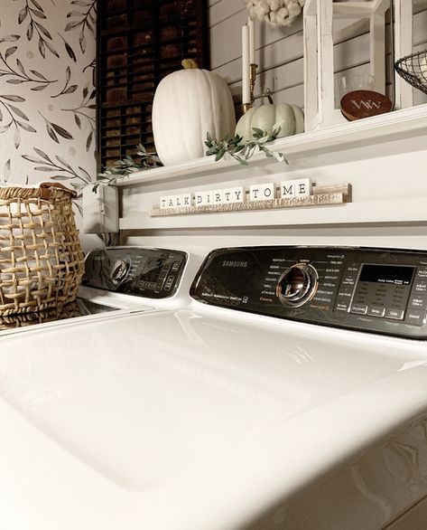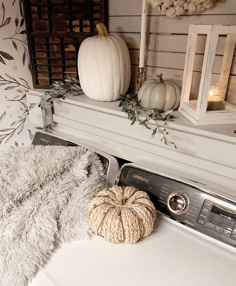 Especially the shelf. I love changing it up for the different seasons. I’m not sure if you know how much I love styling open shelving. Adding a shelf in here was probably the best decision for this space. It allows for decor and personal touches that were otherwise lacking. As well as helps hide the unfinished space behind the washer and dryer. I loved being able to style this shelf for Fall. It turned out so cute.