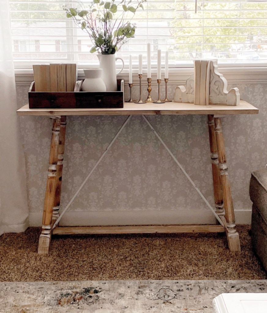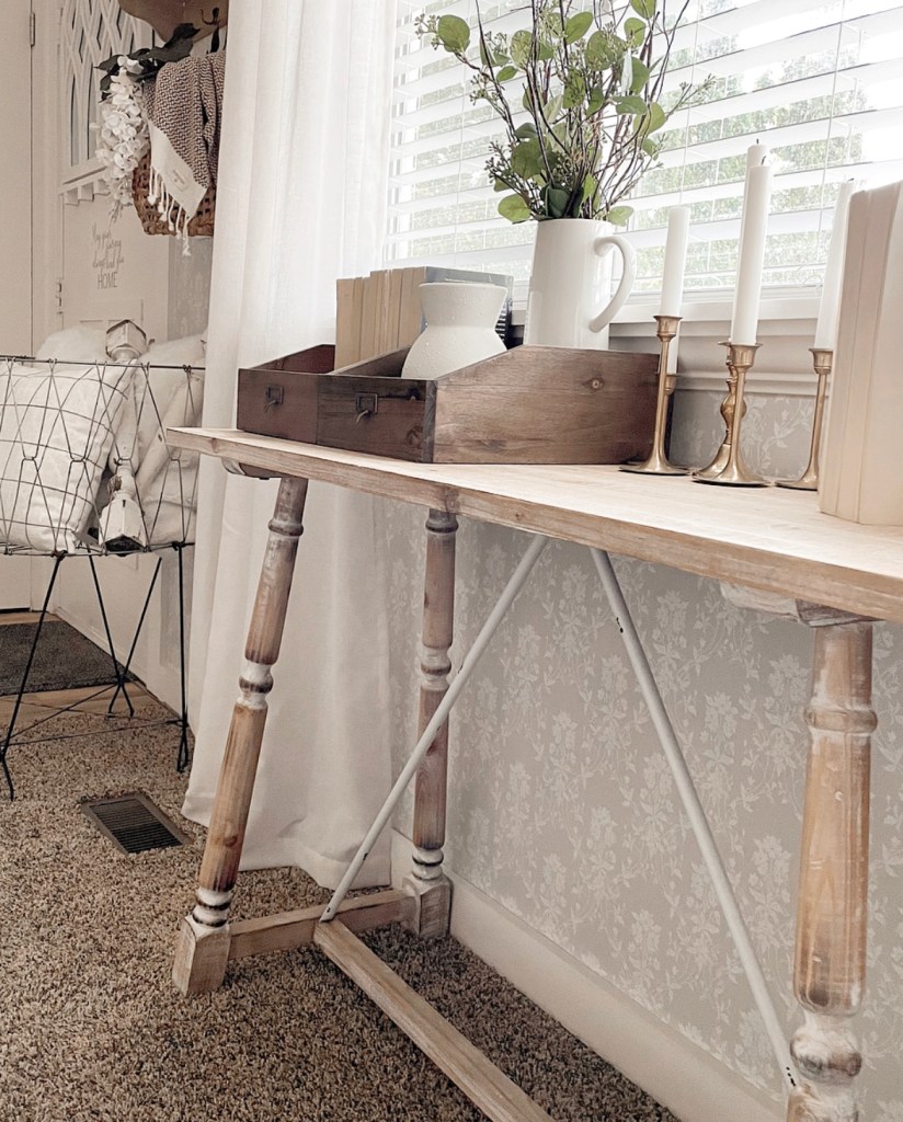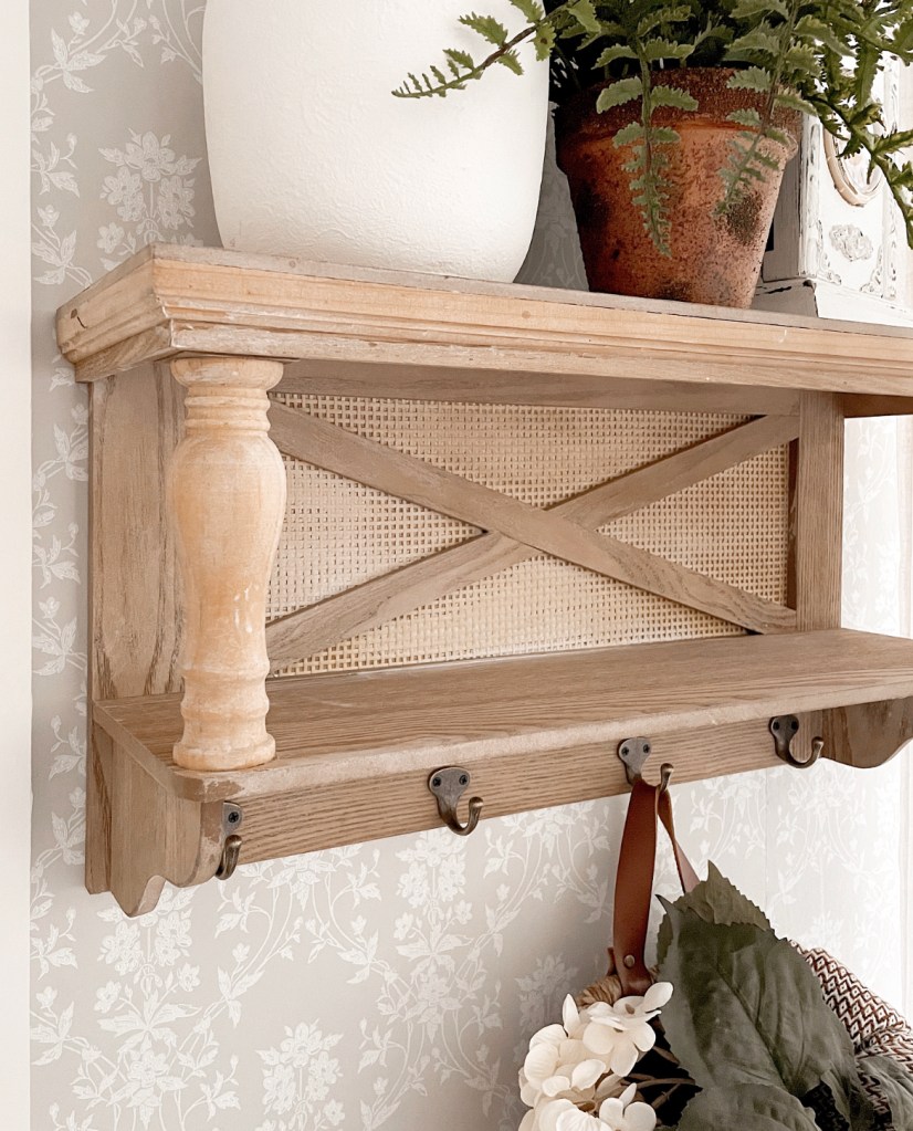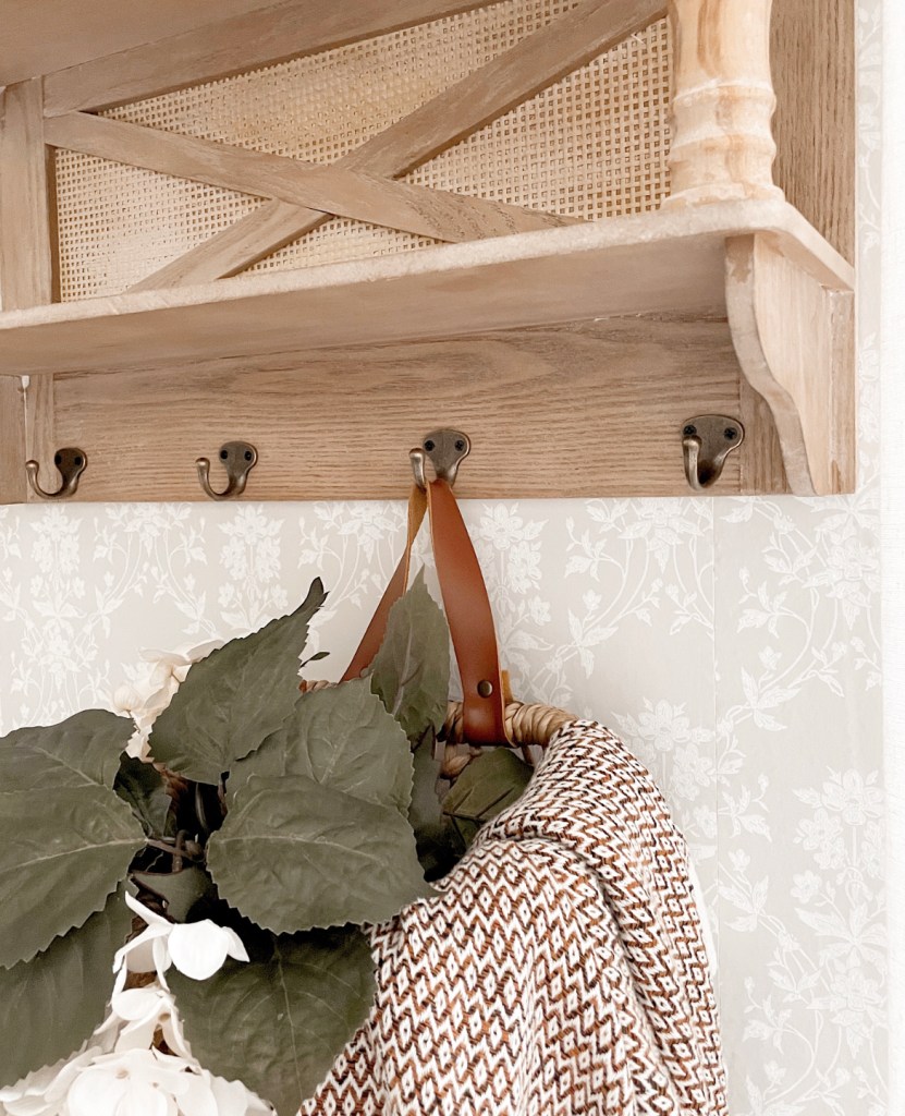 Can you believe what a difference this simple change made? And it only took me a few hours and I did it completely by myself. This is the first time I’ve hung wallpaper in my home. I have done peel and stick before but not actual non-woven, paste-the-wall wallpaper. I bought the wallpaper adhesive on Amazon https://amzn.to/3cx2K3V along with a few tools I might need. Just so you know, the adhesive goes a long way. I did this whole wall and still have over 1/2 of the container left. This wallpaper said to use the paste-the-wall method so I just used a paint brush and painted the adhesive directly on the wall. It stayed wet enough that I could easily move and position the wallpaper. I almost didn’t want to put any of my decor back on this wall because I didn’t want to hide the beautiful new addition. But I absolutely love how this shelf pops against it.