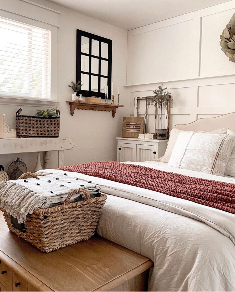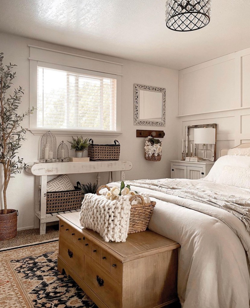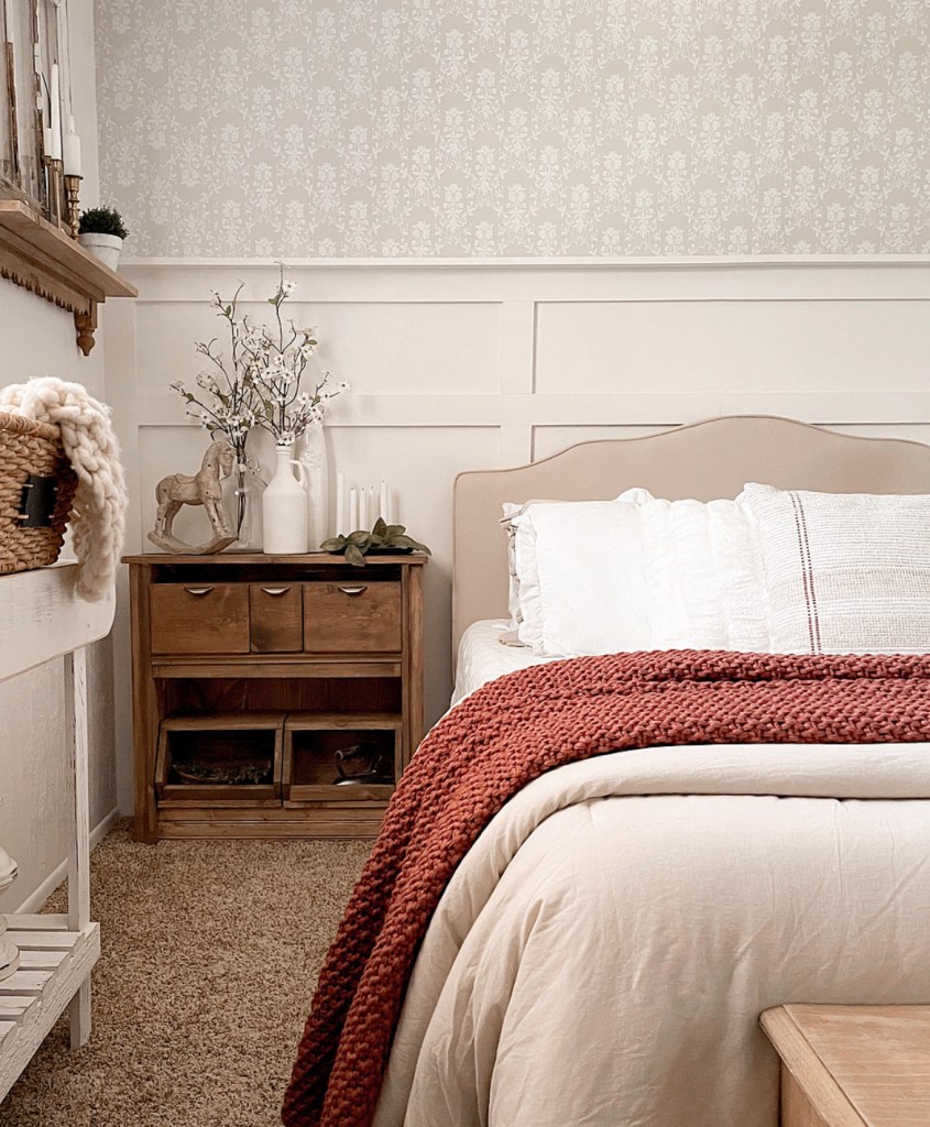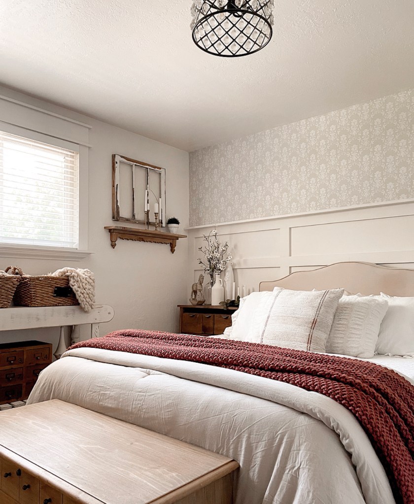 Have you hopped on the wallpaper bandwagon yet? I honestly never really thought much about hanging wallpaper in my house. But after seeing so many Pinterest pins and Instagram posts, I decided to give it a try. The first place I put it was in my living room. See that post here: https://atomic-temporary-192892654.wpcomstaging.com/2021/06/09/living-room-wallpaper/ I love it so much I decided to add it to my bedroom as well. I did board and batten on half the wall in my bedroom a few years ago and have since struggled with the decor situation. or lack thereof, above it. Not that it looked bad. It just needed something.