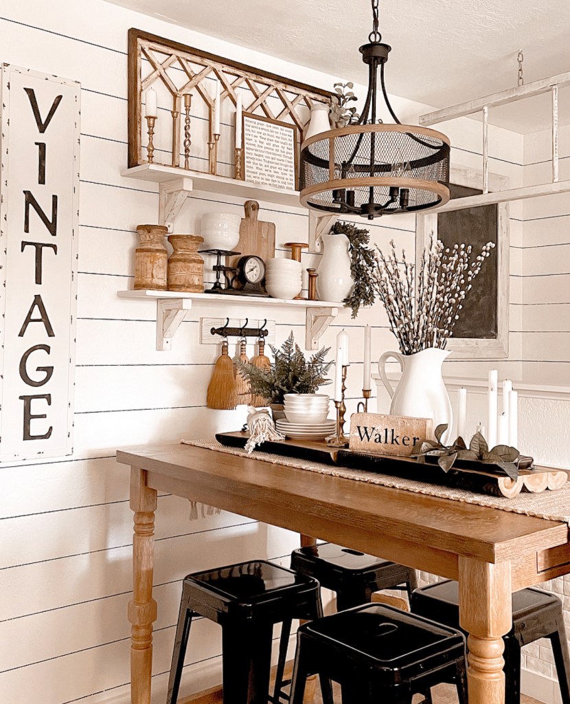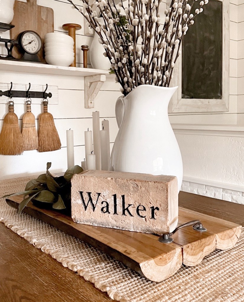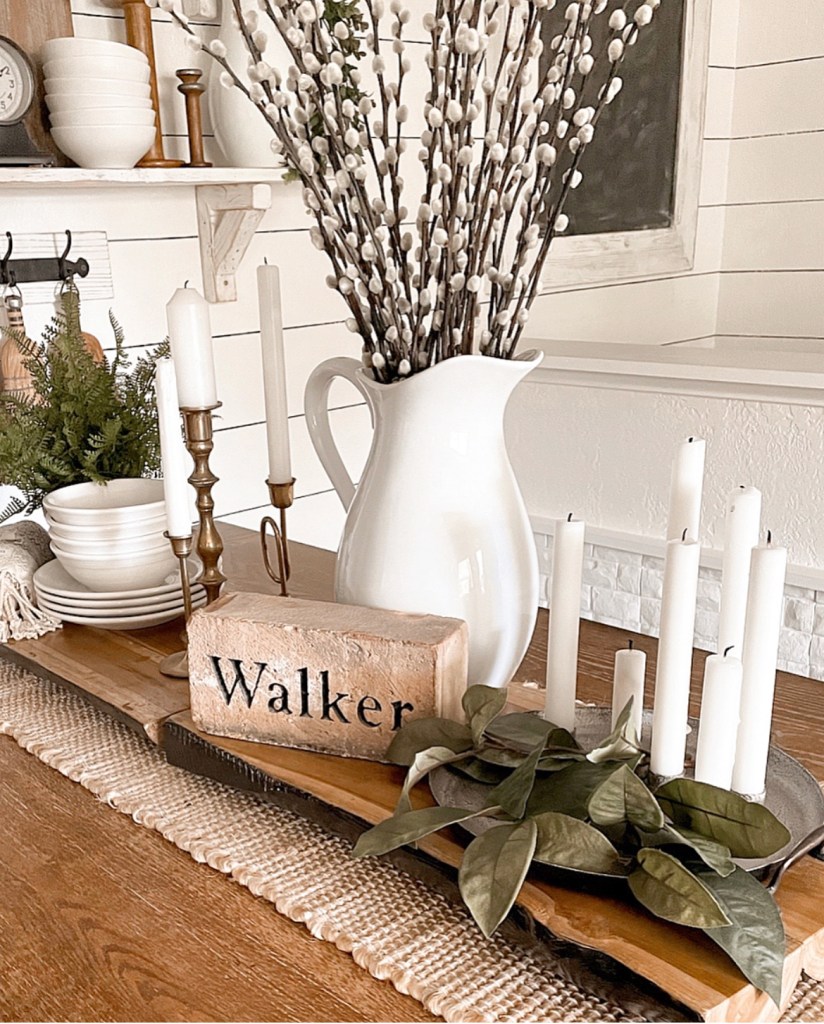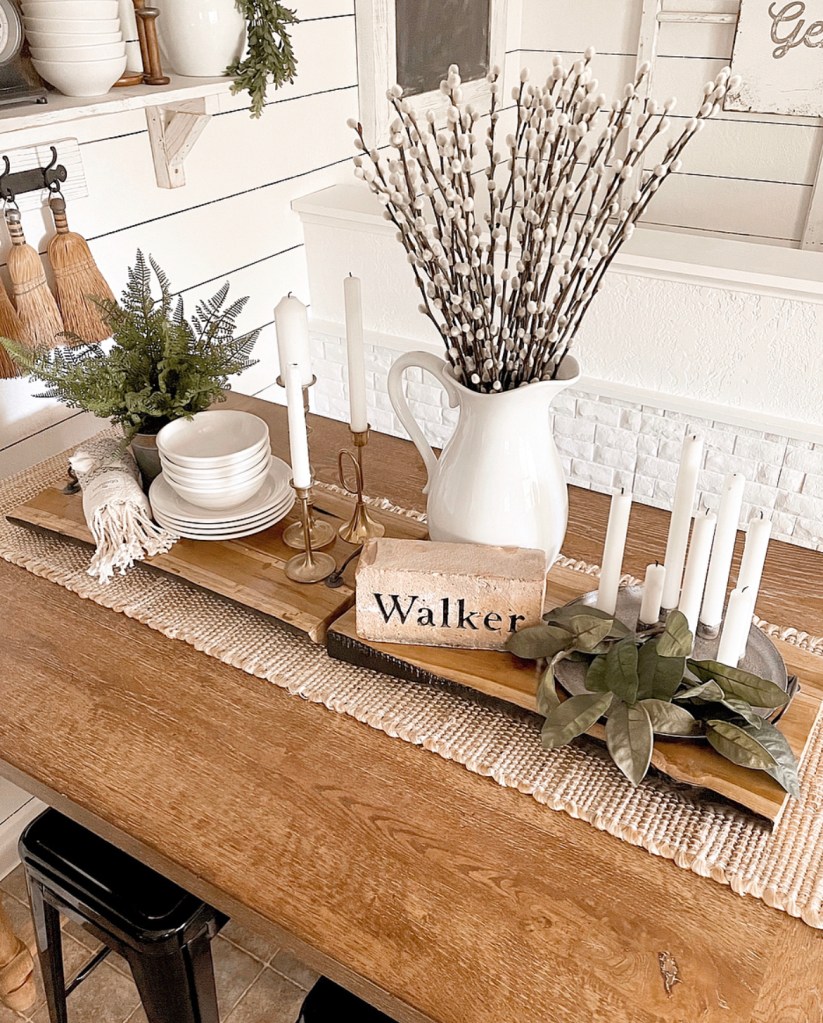 I love how rustic and unique these trays are. And by using them side by side it allowed me to create two separate vignettes that seamlessly flow together. As with most of my table centerpieces, I used my favorite go to items. White dishes, candles and greenery. These things are always the starting point for the decor in my kitchen. Throw in some wood tones and you’ve got the perfect rustic farmhouse look. A little side note…did you know that my shiplap in my kitchen is actually drawn on? It’s true. I used a Sharpie paint pen and a level. It only took a few hours and from a distance you can hardly tell it’s not real. I found the Sharpie pens here https://amzn.to/3zuvqol I love how this particular centerpiece ties in so nicely with the shiplap walls and rustic farmhouse vibe I love so much!
