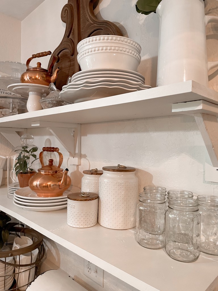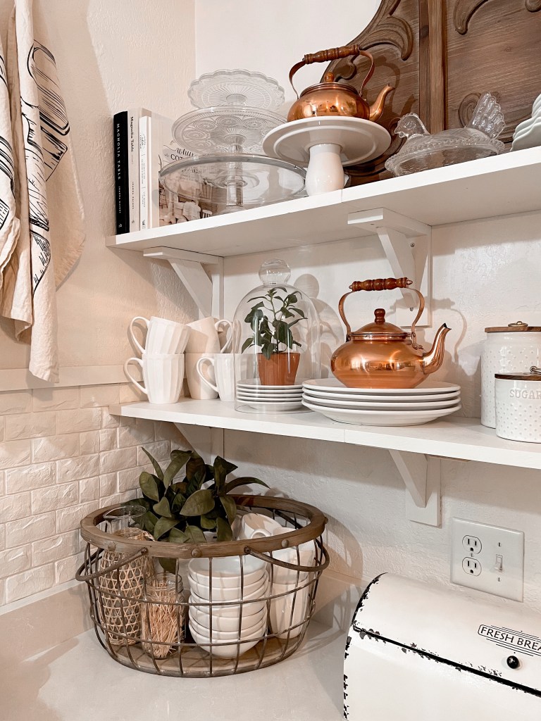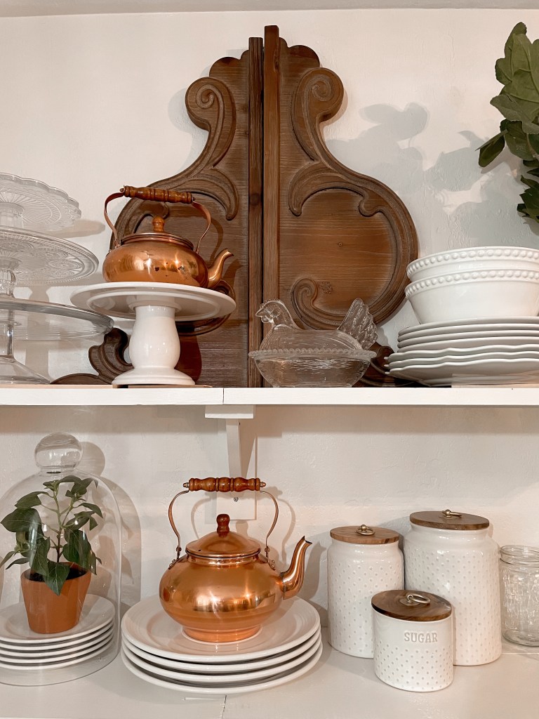 Do you love open shelving in the kitchen? Or dislike it? Do you love it but are intimidated by the styling and upkeep that comes with open shelves? I’m here to help. One of the best decisions I made when updating my kitchen was removing the upper cabinets to install open shelving. It opened up my tiny, dark kitchen so much. And gave me a fun, unique way to display the things I love and all of my pretty dishes. I get asked a lot about how I keep them clean or if it’s a pain keeping them organized. The truth is, I love switching things around. My shelves get changed up quite often. When I restyle them I take everything off and wipe down the shelves and all of the things. We use some of the items on the shelves which also helps keep things clean and organized. I just recently restyled my kitchen shelves and I’m loving the simplicity with the woods, whites and greenery. With just a little splash of copper.
