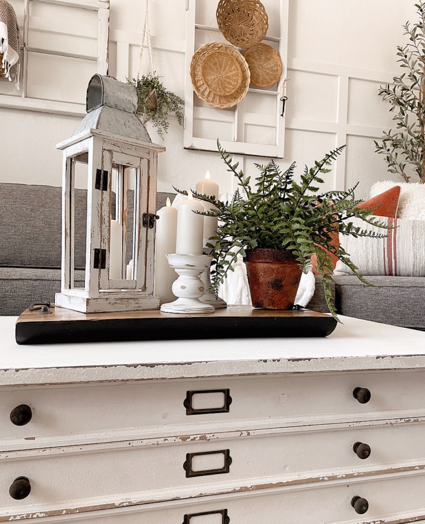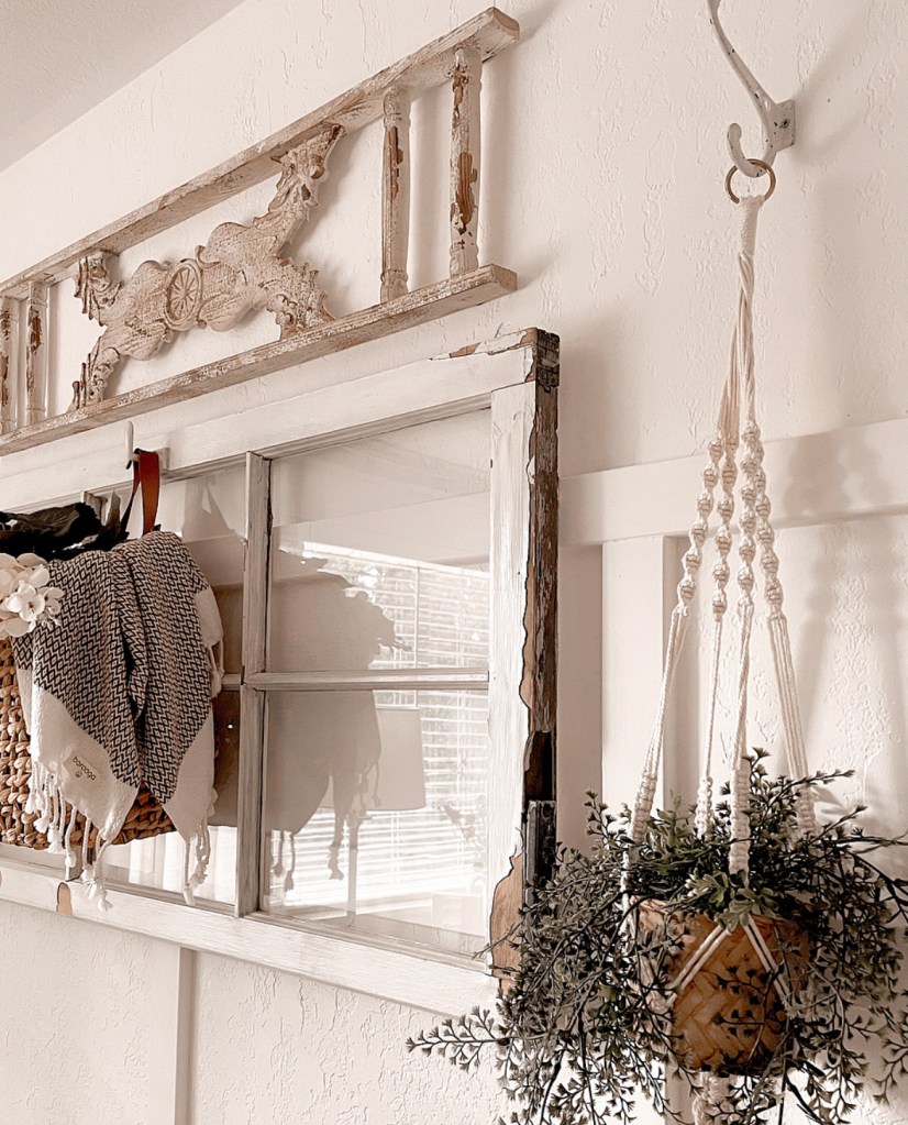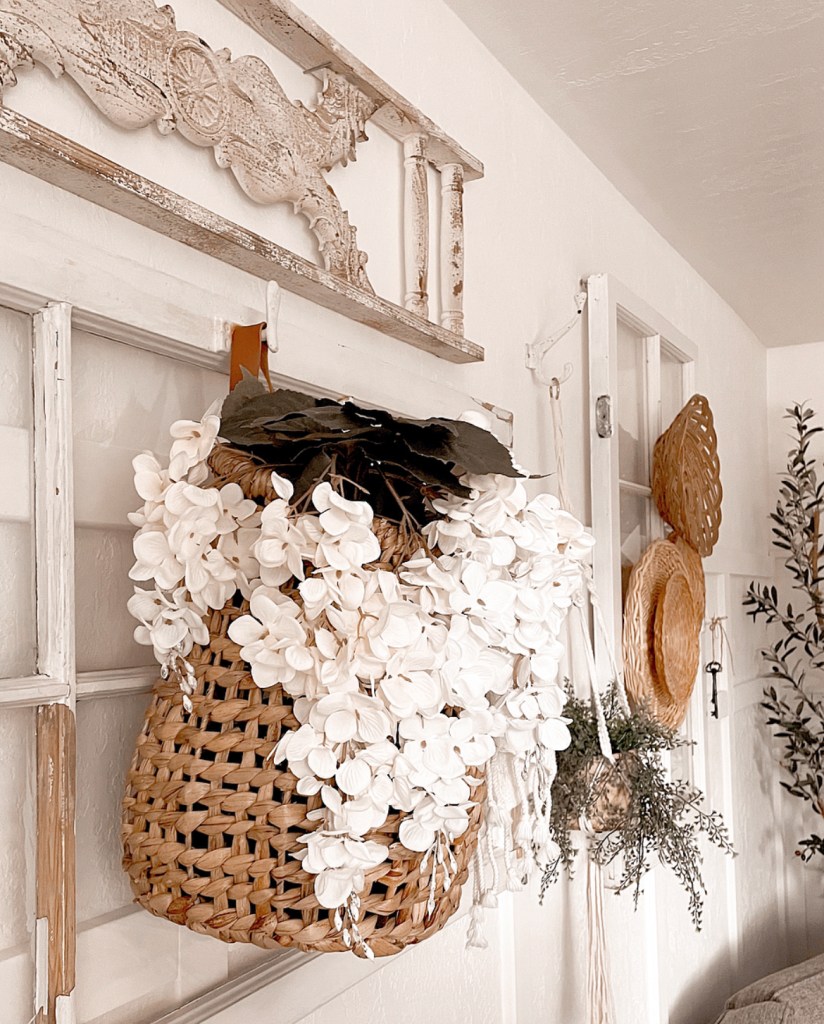 The baskets layered on the windows, the hanging plant and the architectural piece added just the right amount of texture and color. Giving the wall the woods and whites look that I love so much.Our living room feels so much cozier, warm and inviting. Which is my goal with my home, always.