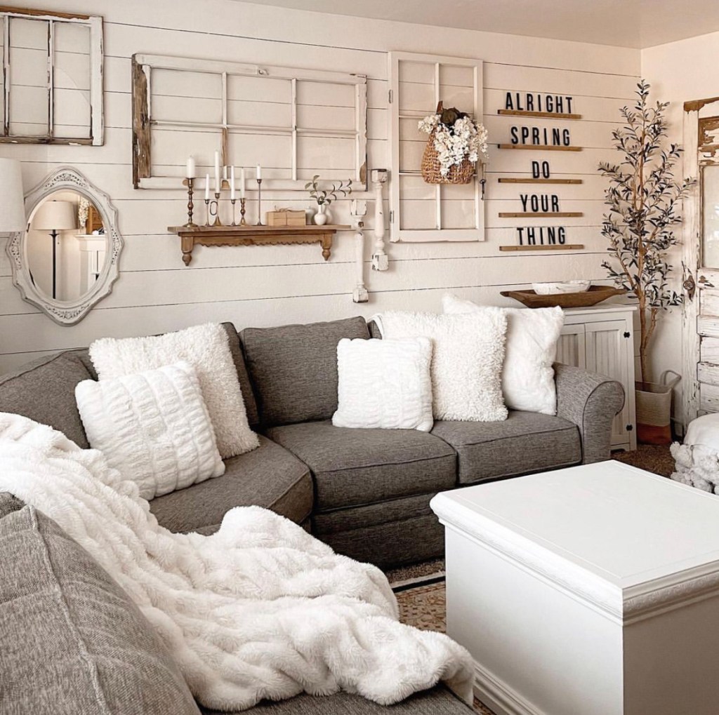 I love decorating with old windows. The chipping paint, cracked glass and missing hardware. All the signs of days long gone. I wonder what kind of home they adorned. Who the people were that once looked through them. They are a timeless piece of decor that I never tire of. I especially love using them as part of a gallery wall. I had my favorite gallery wall in my living room but when I added the board and batten I was unsure how I was going to make a gallery wall work.This is what it looked like before the board and batten.