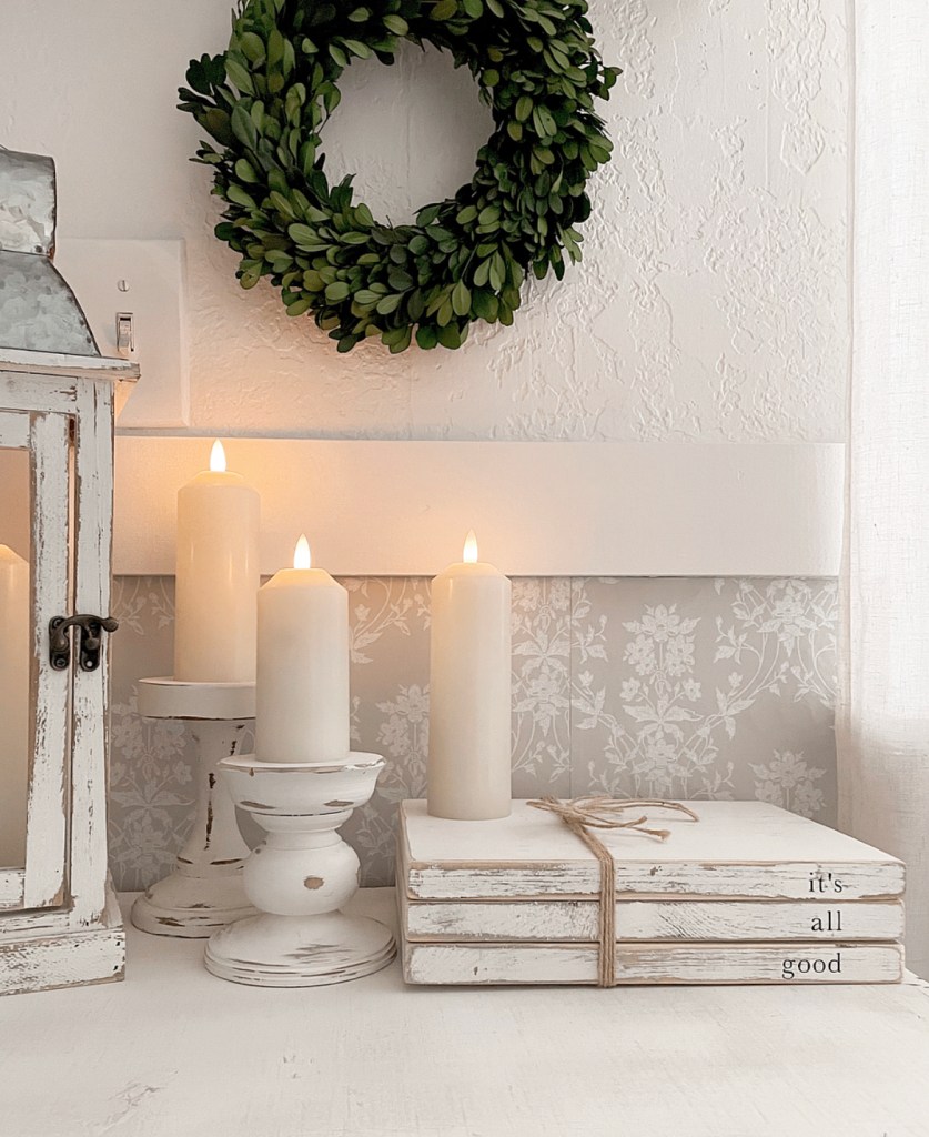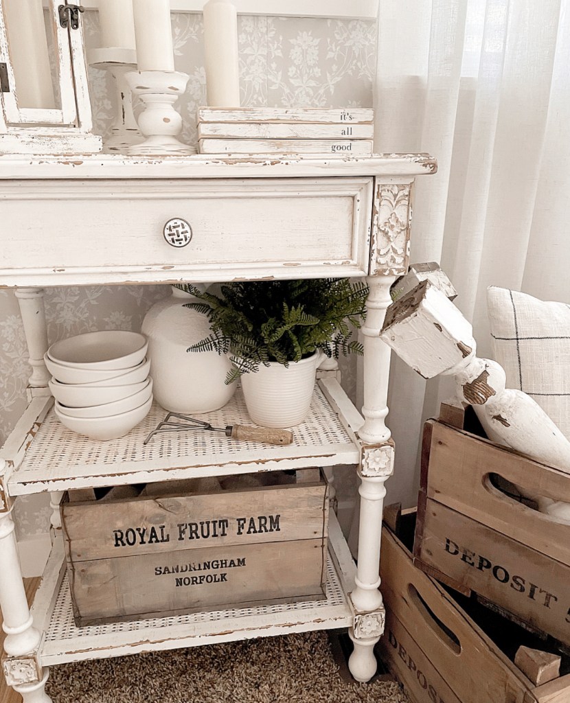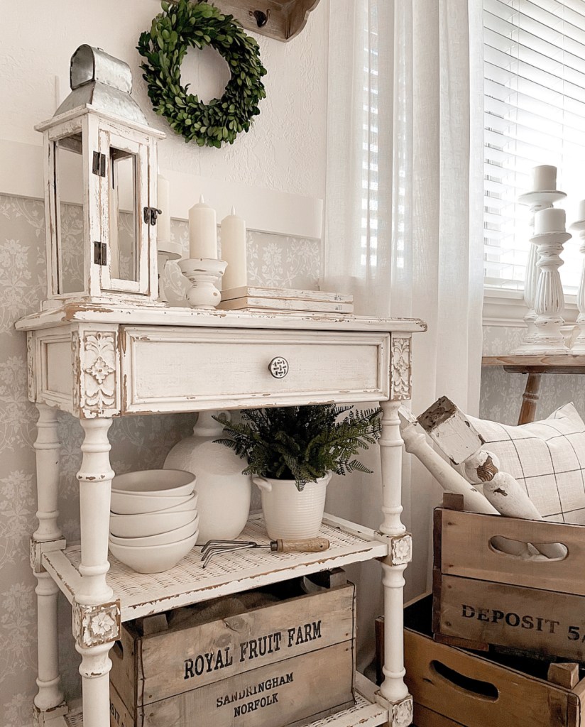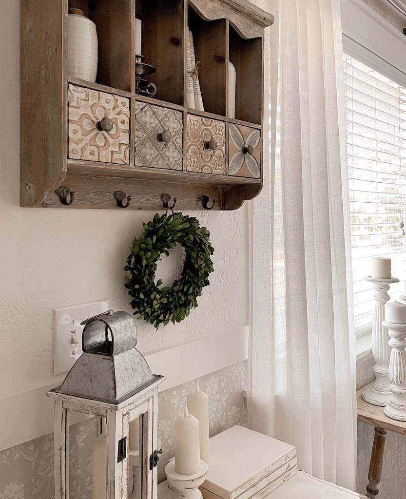 What do you think of when you hear cozy cottage style? For me, it’s creamy whites mixed with light wood tones, candles, greenery and chippy painted surfaces. It’s a style that is reminiscent of a simpler time. We have this little space by our front door that I felt needed some cozy cottage vibes. I recently got a couple of new items (an end table and a shelf) from Decor Steals that I knew would be perfect for this space. I absolutely love the details on the little end table. The flowers carved in the wood, the perfect distressing and the wicker shelves. It gives me all the cozy cottage feels. And the shelf above it is just as beautifully detailed.