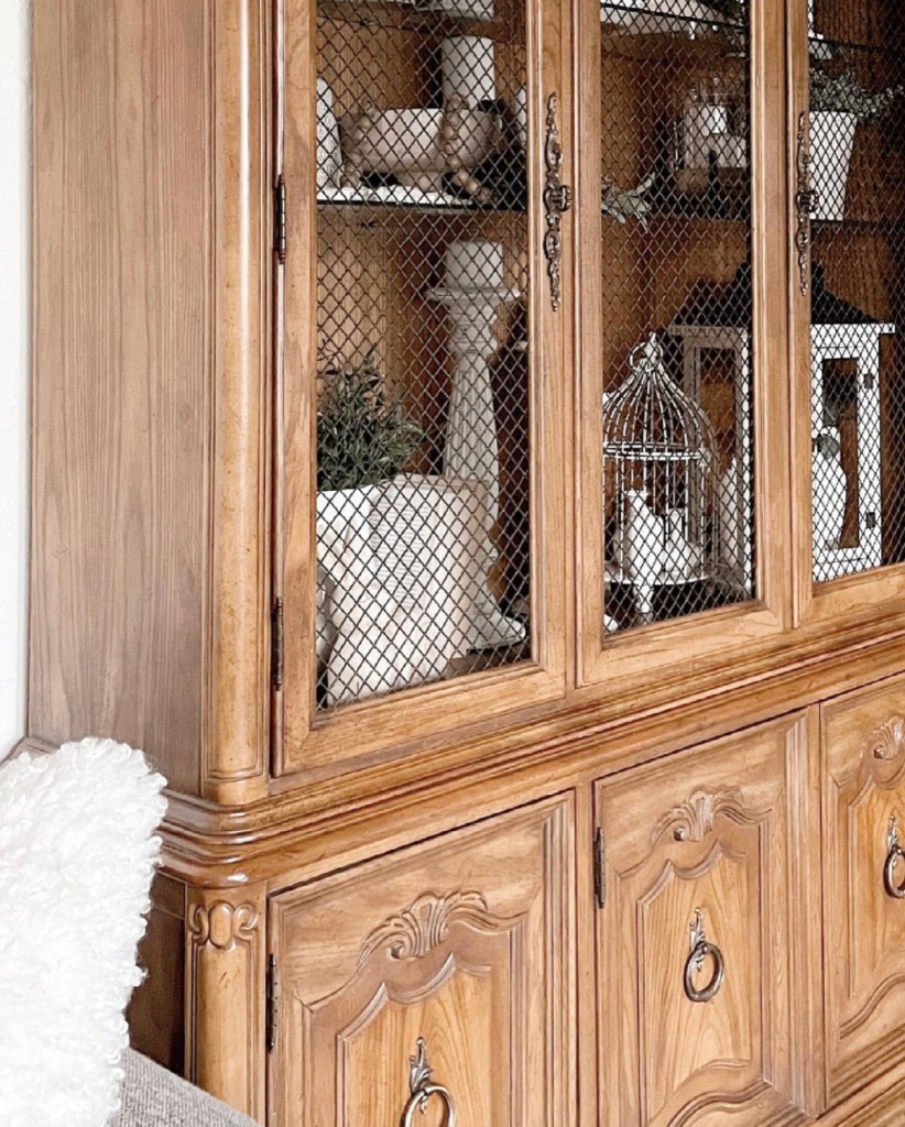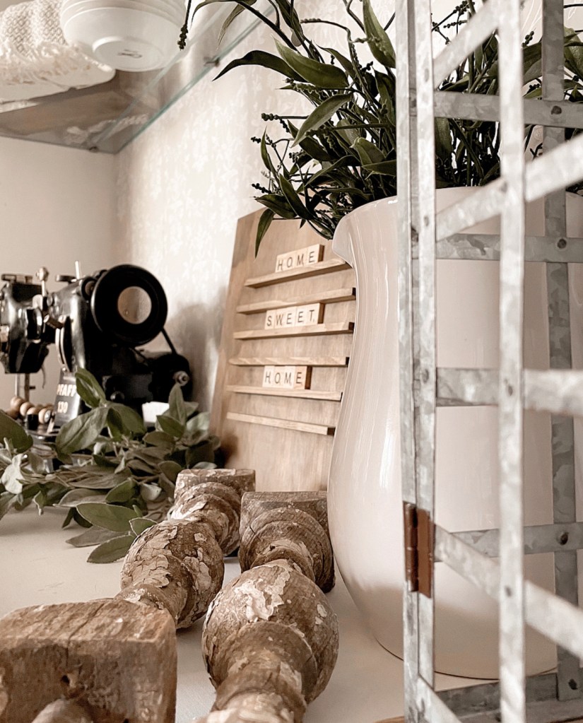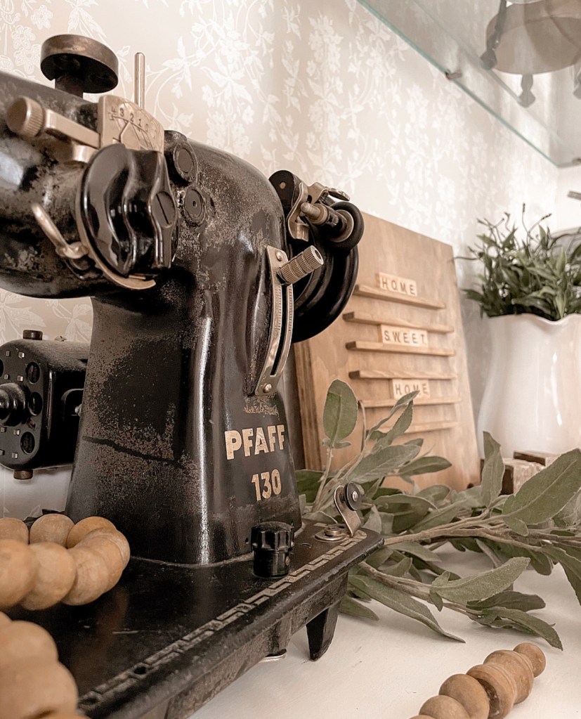 Hutches are one of my favorite things to style. It’s such a fun way to display all of my favorite things. The sewing machine belonged to my grandma. I love all things vintage so having this antique memento from my grandma is so special. I love having items in my house that hold sentimental value. Items that tell a story. Even if I don’t know the story behind it. I like to imagine it has one to tell. Whether it’s an item that is dear to me or one found at goodwill or while thrifting.
