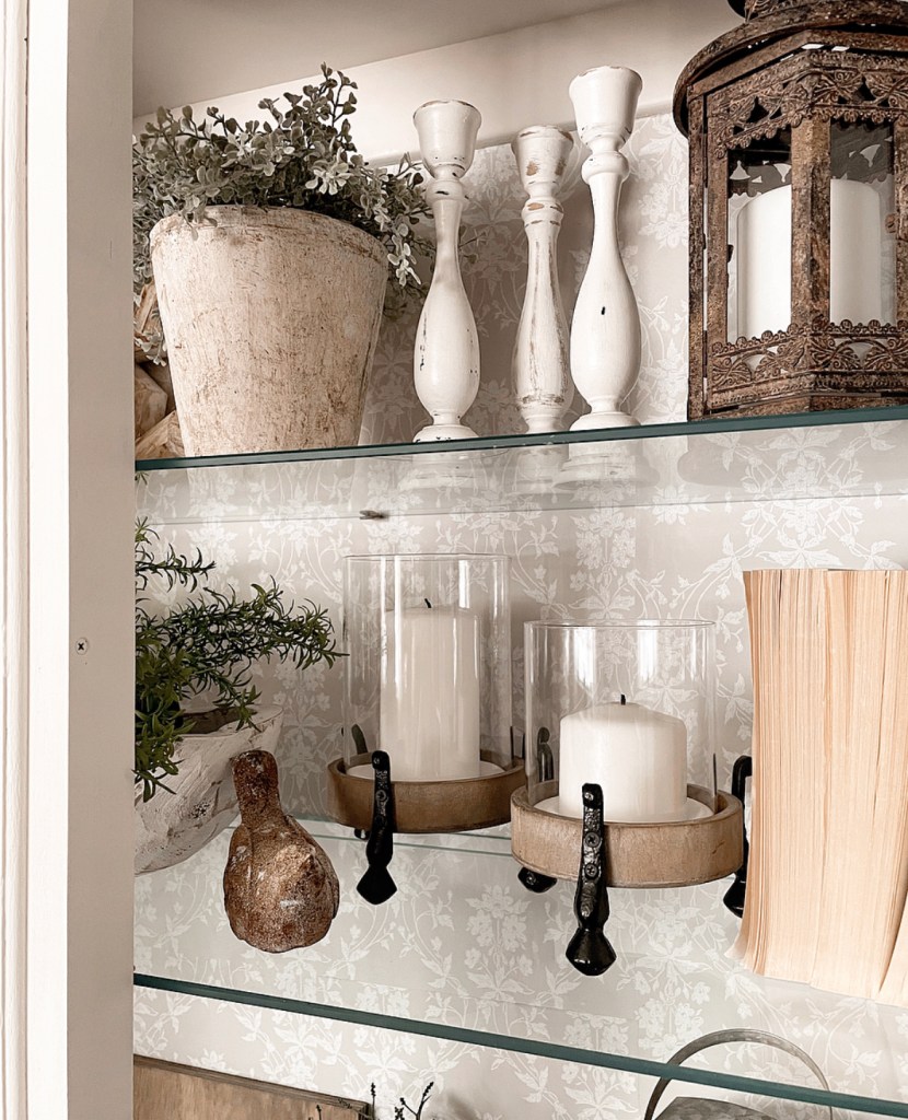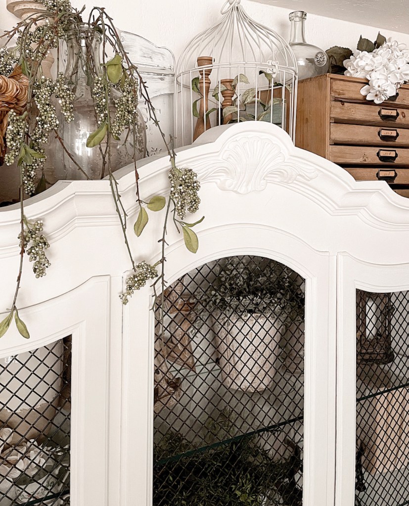 The fun thing about hutches and curios is that you can fill them with literally anything. From fine china to quirky collections. They make amazing storage pieces to display all the things. I like mixing different textures and pieces and utilizing every inch of space, including the top. Who says you only need to decorate the inside when you have all that space on top too. When I style any space, I like to layer and mix textures. Keeping spaces filled in by using varying heights, greenery, books, etc. To some it may seem overcrowded and cluttered, but it’s my decor style and it’s a style that I never tire of. Even with the beautiful arched detail on the top it just seems more complete with the decor on top.