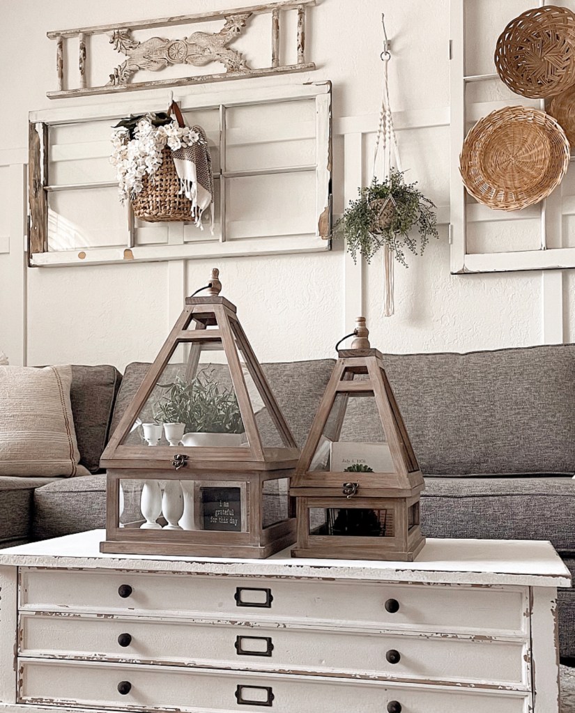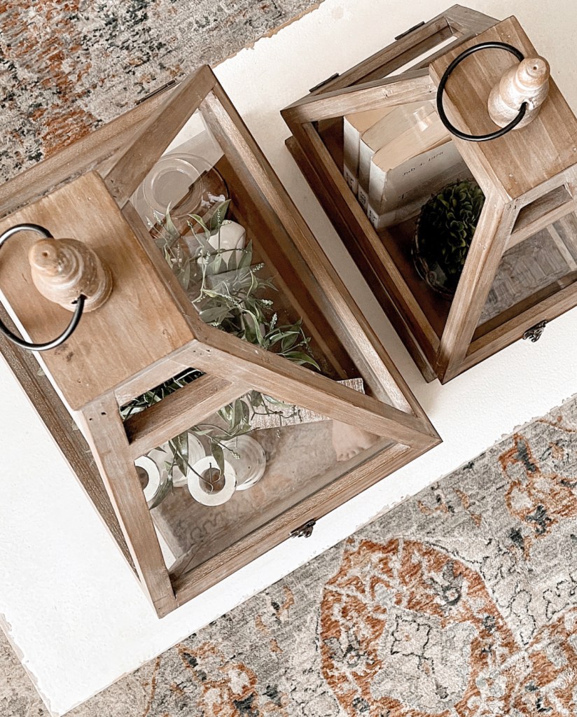 I added some amber bottles, candlesticks, a small sign and a vase with some greenery to the large one. And vintage books with some boxwood balls in the smaller one. I’ve really been drawn to these lighter wood tones lately and I’ve been incorporating them into my living room decor. This color looks so pretty with the creamy white paint I have throughout my home. These are quite large for coffee table decor but our table sits low and so I love the added height these add. I hope this inspires you to think outside the box when styling your own coffee table. Have a great night friends!