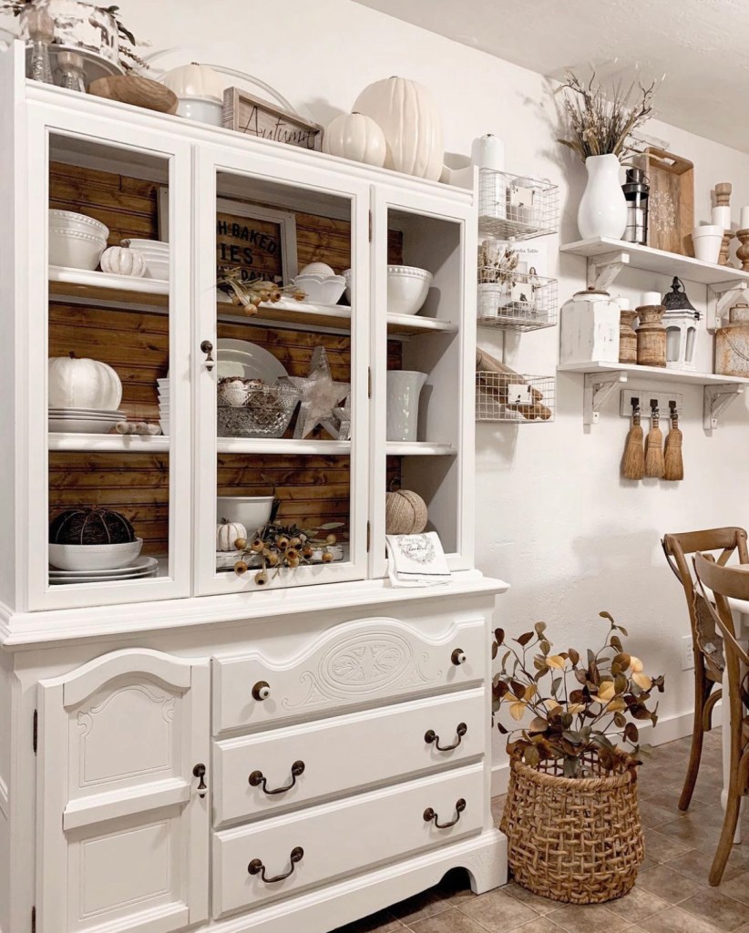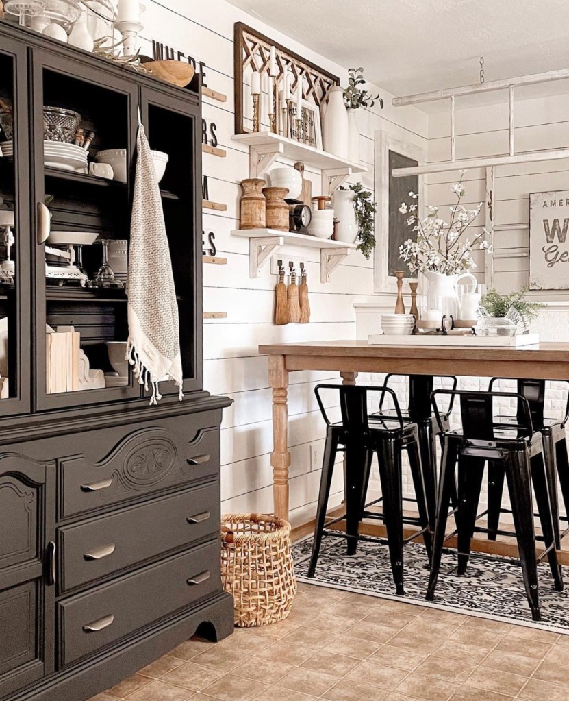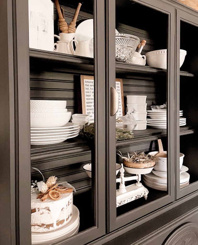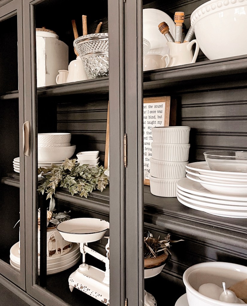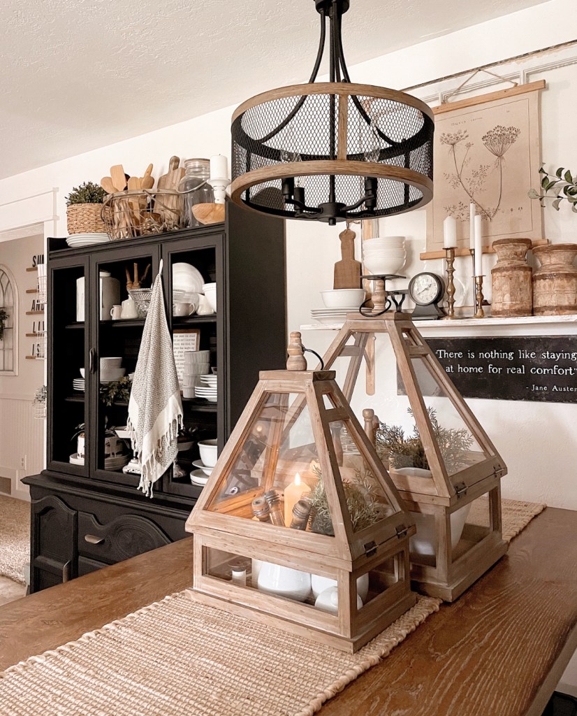 Of all the places it’s been, I think the kitchen is my favorite. And I love the black. It makes the white decor inside stand out so beautifully. My dining nook has gone through so many fun changes. I always love changing up this space. Whether it’s giving my hutch a little refresh or adding new decor to my table. This past weekend, I did just that. Starting with just a few little changes in my hutch and adding some new, super cute terrariums to my kitchen table.