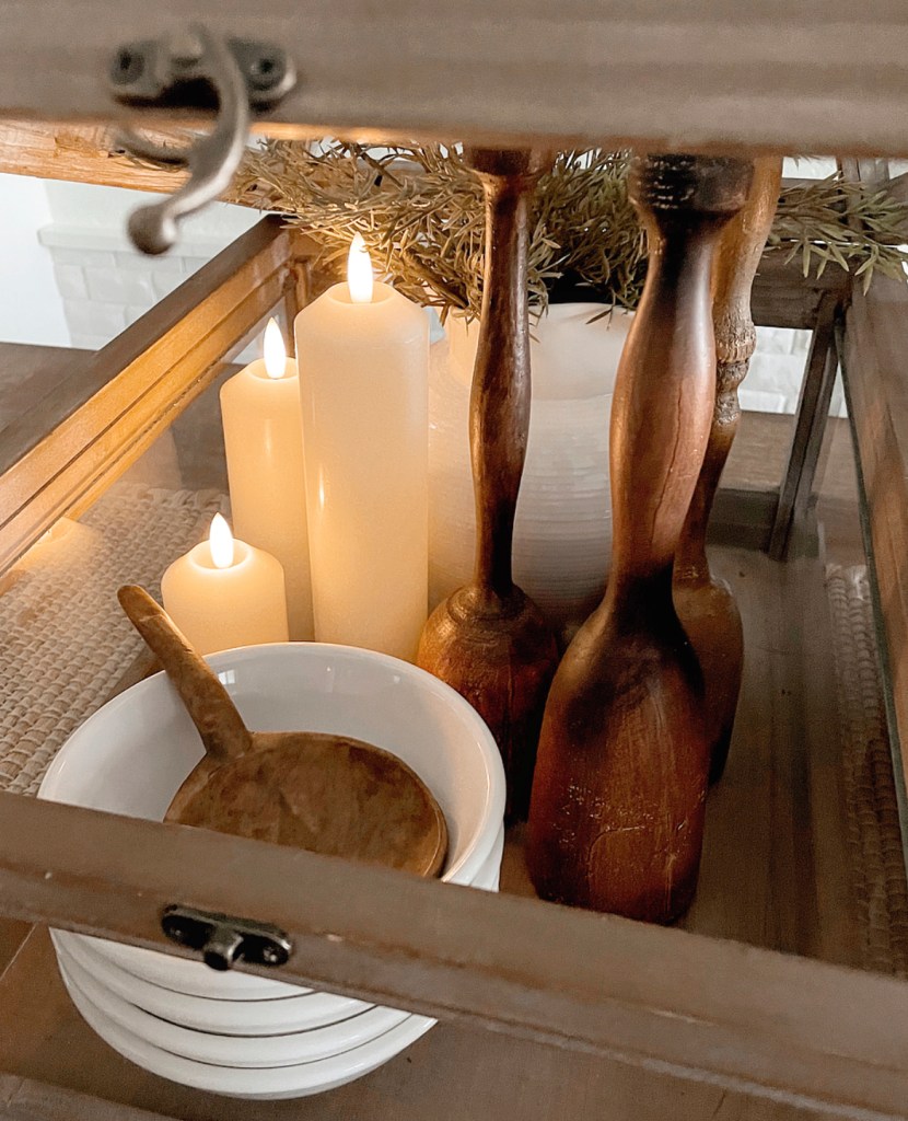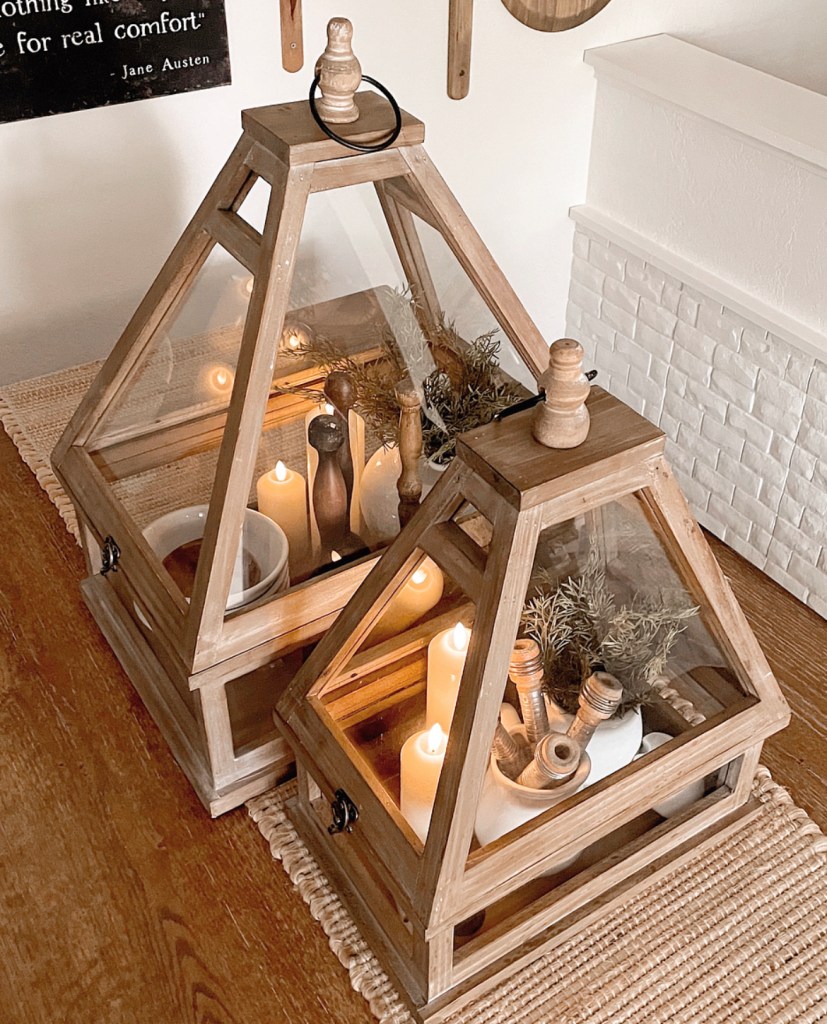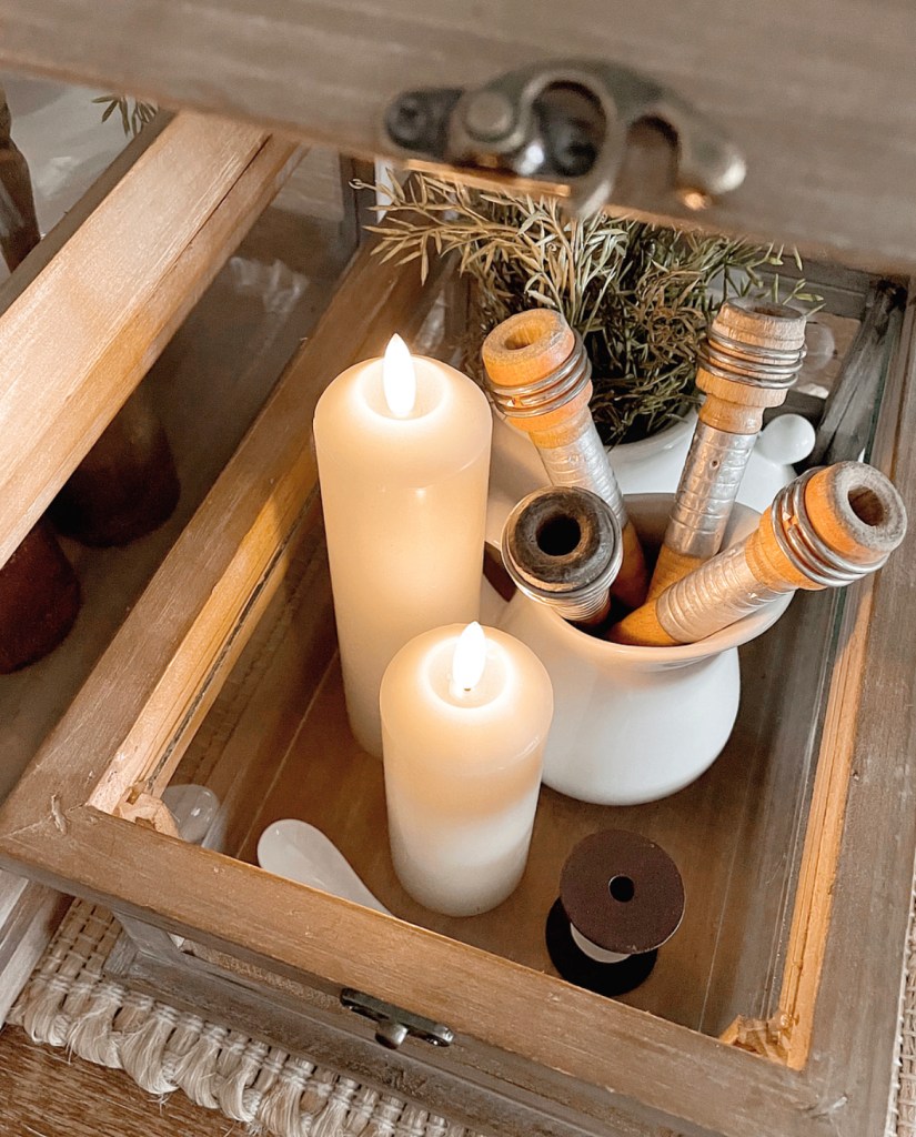 Aren’t these terrariums adorable? I had so much fun adding decor to these.The candles are a super fun addition. They look incredibly real. Hint* They’re not. They are from Amazon. You can shop them here. https://amzn.to/3wOJwOv I also added some greenery, dishes and a few vintage items.