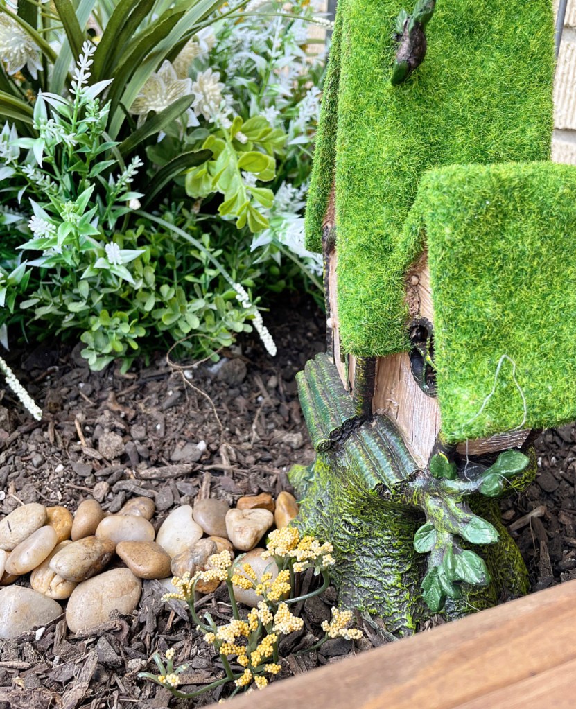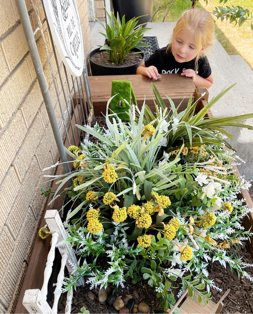 I had a bunch of faux flowers and greenery in storage and the garden box was already full of dirt from my failed attempt at a small veggie garden. I picked up the little tree house and other accessories at Hobby Lobby The little white, chippy ladder was a fun little DIY I made. My niece loved helping with all the little details. From the rock “creek” bed to the little rock path upto the “fairy” treehouse. We had so much fun. But my favorite part was watching her wait for the fairies to come. Aww, to be a kid again. So full of wonder and belief that magic still exists. Completely oblivious to all of the problems we face as adults. And for just a moment I got to step into her little world to watch and wait for the fairies to come. Just a few moments of forgetting that I have loads of laundry waiting inside, a grocery list I needed to finish and a house I need to clean. Just a few moments of waiting patiently with her for the fairies to appear. And believing that they actually might. And then just like that, bam! It’s back to reality. I hope you all get a chance today to step into a world of make believe, if only briefly, to forget about the things that need to get done and just be present in that fleeting moment.