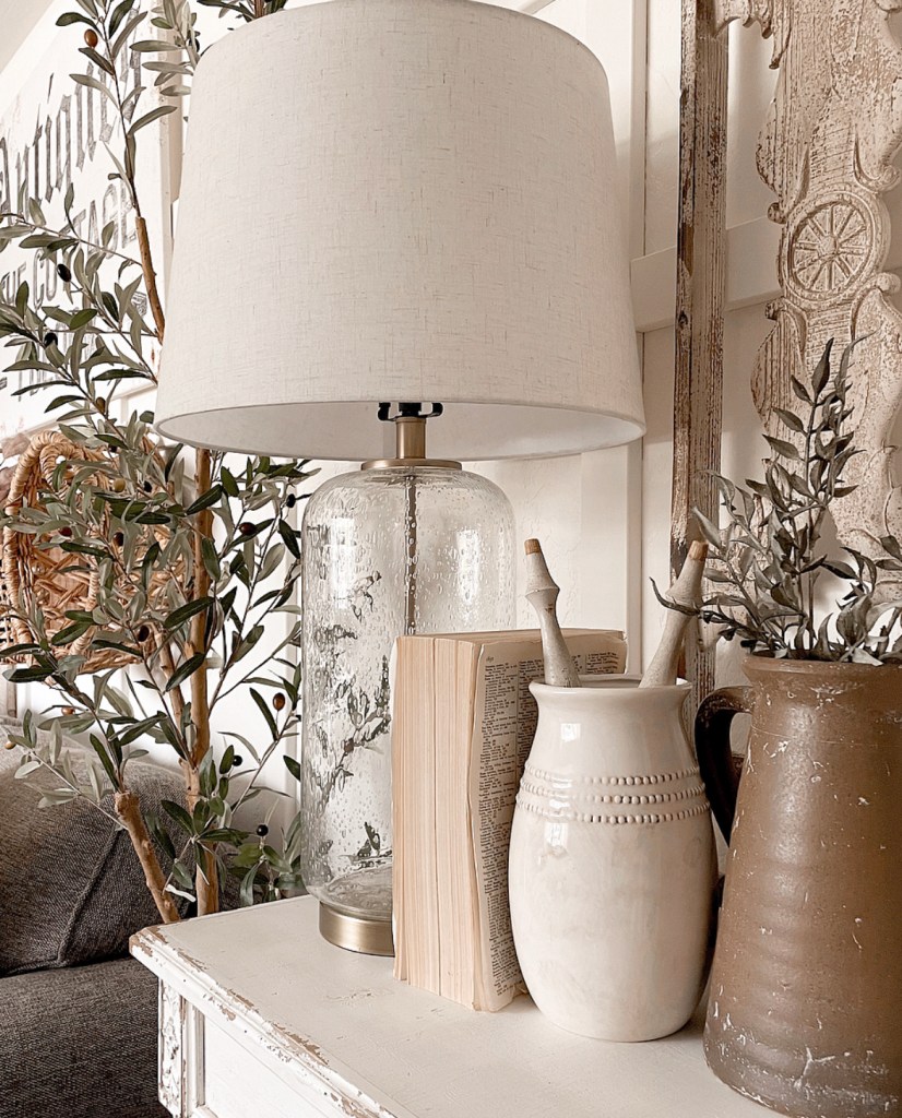 The size of canvas I chose is 32 x 48 inches. And my favorite thing about their canvases is how lightweight they are. And available with or without a frame. I chose to have mine without a frame. I absolutely love how this wall is coming together. And I’m not sure if you know this but I love peg hooks. So I decided to add a few to my board and batten. I’m so glad I did because it gives this wall some much needed warmth and texture. I also added some Fall foliage (no judging) it’s totally http://www.michaels.com fault. I went in for some stencil brushes and left with a couple cute vases and some Fall foliage and greenery. I also picked up this cute new lamp from Target.