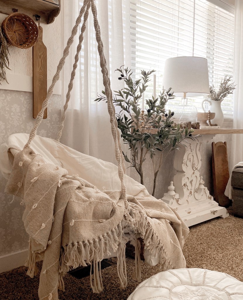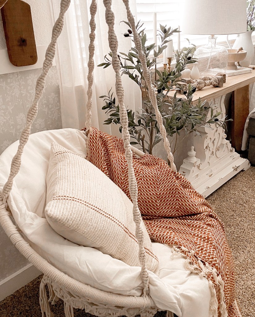 Happy Tuesday sweet friends. Question…do you like to read? I love reading. And I’ve always wanted a cozy spot in my home to curl up in with a good book and a cup of coffee. A reading nook…if you will. This isn’t quite a nook, but I love how cozy this space feels with my new hanging chair. This chair is from http://www.songmics.com and it is seriously so cute. Not to mention, super affordable. My husband was super nervous to hang it inside because he was afraid it wasn’t going to hold in our ceiling. But we found a truss (with the help of my hubbys stud finder) and screwed a eye hook into it. We then bought some chain from Home Depot and hung it using a carabiner that opens easily. That way I can put the chair up when my niece and nephew come over. I love them but I guarantee they would get crazy in the swing and stress me out. Haha. Do you have a reading spot in your home? Or just a cozy alone time spot?