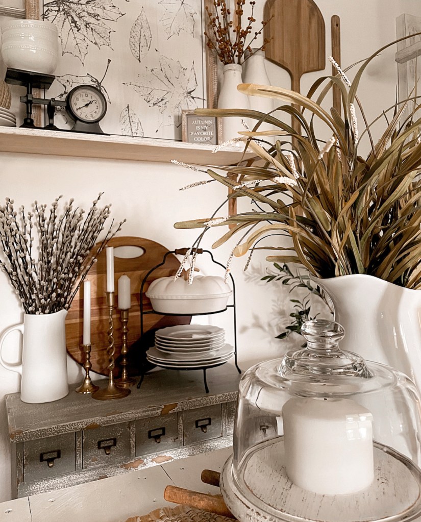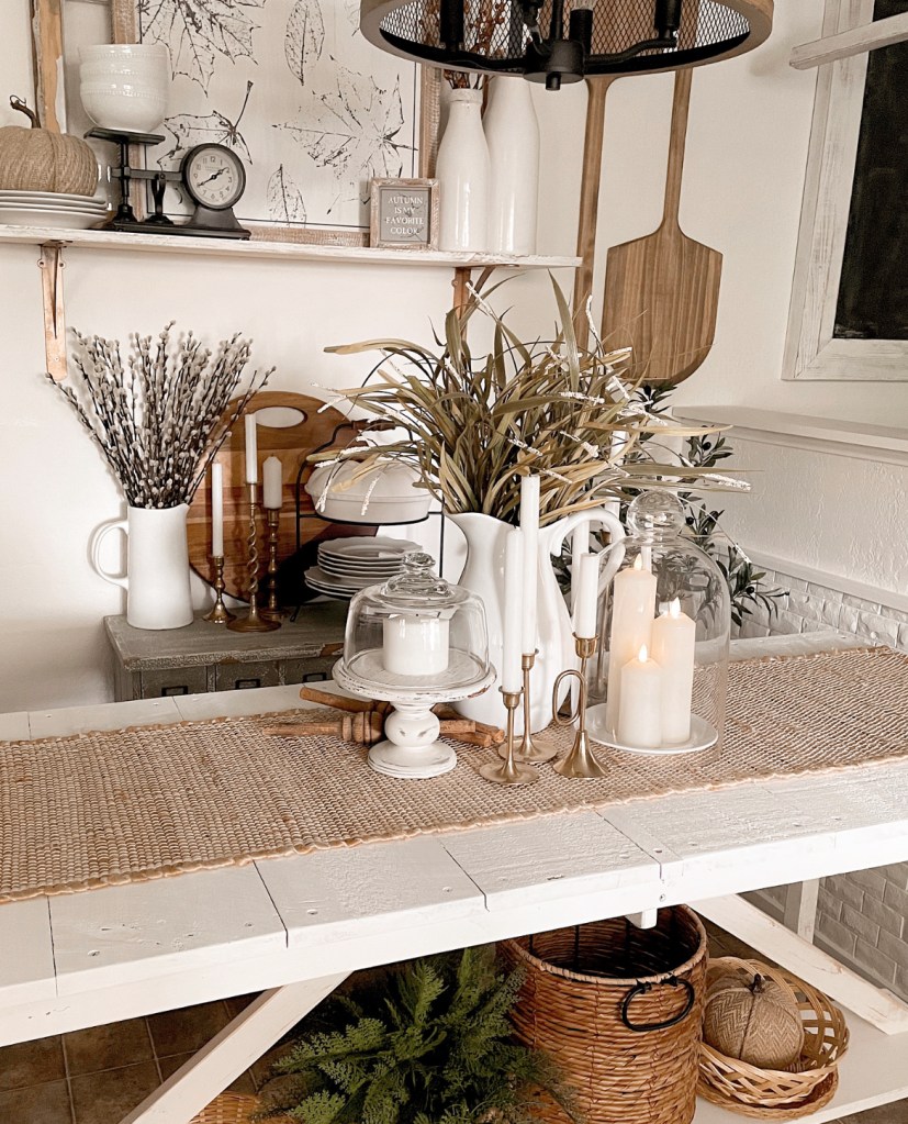Happy new week friends! What is your favorite season? Mine is definitely Fall. And since we’re half-way through August it’s time to start bringing out the Fall decor. I got all of my totes out over the weekend. It’s always fun to take inventory and see what you’ve got to work with. And it always amazes me how much I forgot I have. I guess it shouldn’t surprise me since I literally forgot what happened last week. But every year I do like to go through all of my seasonal decor and get rid of the things I no longer use or that don’t quite fit in with my current style. As I’m sure most of you know, our styles change and what was cute a couple of years ago, just doesn’t work anymore. I’ll be going through totes the next couple of days and figuring out what stays and what goes. I also like to clean and declutter before a new seasons decor goes up. I did manage to get some Fall decor styled in my kitchen. We sold our kitchen table and added this table my husband made instead, which is a little smaller. But I love it.