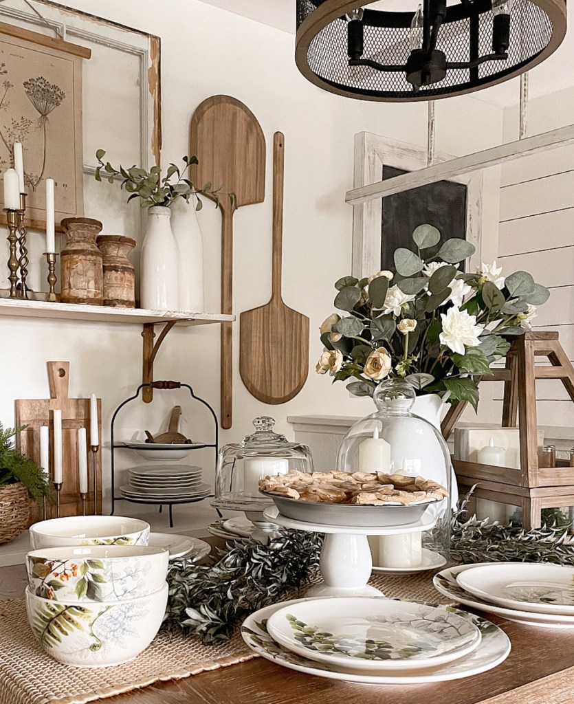 My dining nook is another area I love making cozy. The secret? Woods and whites. With just a tiny splash of color. Warm woods and creamy whites are the perfect combination to create a cozy home. Especially if you throw in some pretty dishes, brass candlesticks and greenery. A fresh baked apple pie doesn’t hurt either (although this particular pie is fake.) Shhh…no one will ever know. Which brings me to another element. Scent. Did you know that if you’re selling or staging a home that baking cookies or burning a candle that smells like baked goods increases your chances of selling? It helps potential buyers see themselves in that home by making them feel at home. Have you ever walked into a home or store that smells so good you instantly feel calmer and welcome? Making you want to stay longer and visit or browse the aisles. I’m a huge fan of candles and wax melts. My favorite go to scents are vanilla, cinnamon, clove, orange and anything woodsy. My sweet friend Shannon at Greyden Candle Company has one of my favorite scents of all time. It’s called Campfire and it’s the perfect scent for Fall and Winter.