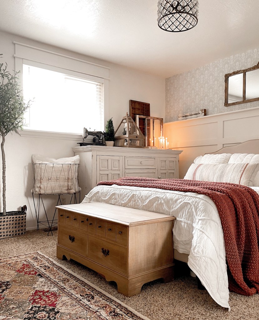 To create a cozy home doesn’t always mean adding color. But I find in certain rooms in my house that adding a bit of color, especially warm colors, gives the room an inviting, cozy feel. I especially like to use these elements in my bedroom. I think it’s important to have a cozy bedroom. It’s a place that is quite literally meant to be relaxing. I love crawling into a cozy, warm bed at the end of each day. And then waking up to the sunshine pouring in. I always say that if getting out of bed in the morning is hard then you’ve created the perfect cozy space.