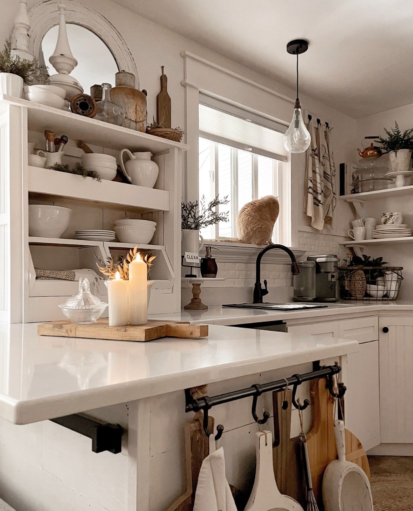I have very little color in my kitchen. It’s a space I like to keep clutter free as much as possible. Especially with the open shelving. I love my shelving but if too many things are thrown into the mix it can look cluttered and untidy. But by adding in the warm wood tones, candles and some greenery I can still achieve that cozy inviting feeling. Afterall the kitchen is the heart of the home. Or at least it is in our home. Even Jordi, our fat, very spoiled cat, would agree. His favorite spot in the house is in that window watching the birds.