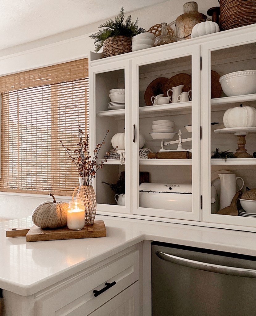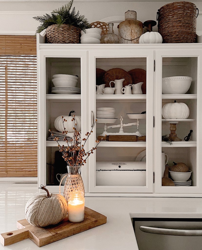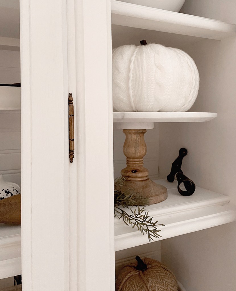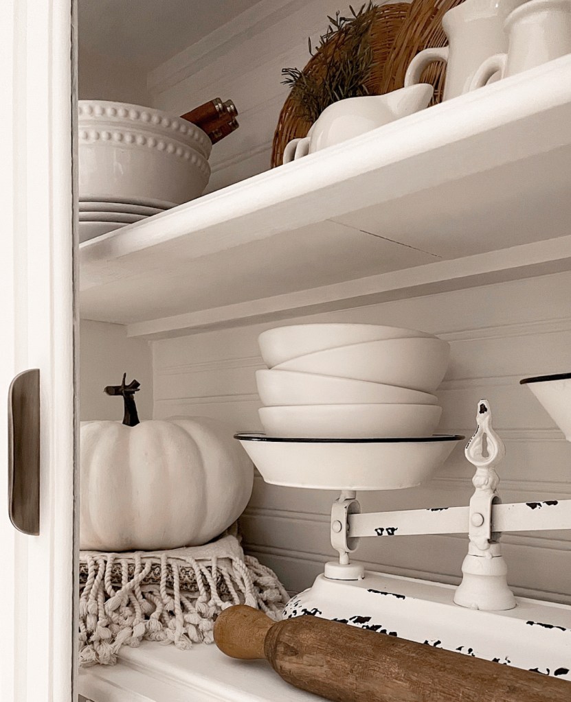 This particular one (above) was a bright orange. But I loved the shape so I bought it knowing I could just paint it. It’s a quick and easy way to refresh your seasonal decor. I used Glidden interior flat paint in Antique White. You can find it at Home Depot. It’s my go to paint for all the things. Including the hutch. I’m loving the Fall vibes. Especially with the cooler temps right now. Have you been adding bits of Fall around your home?