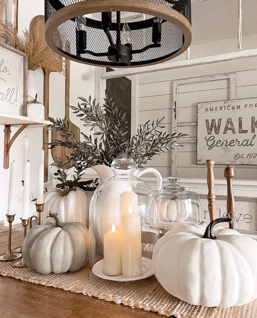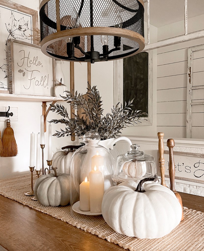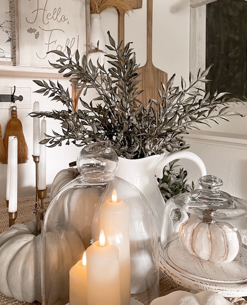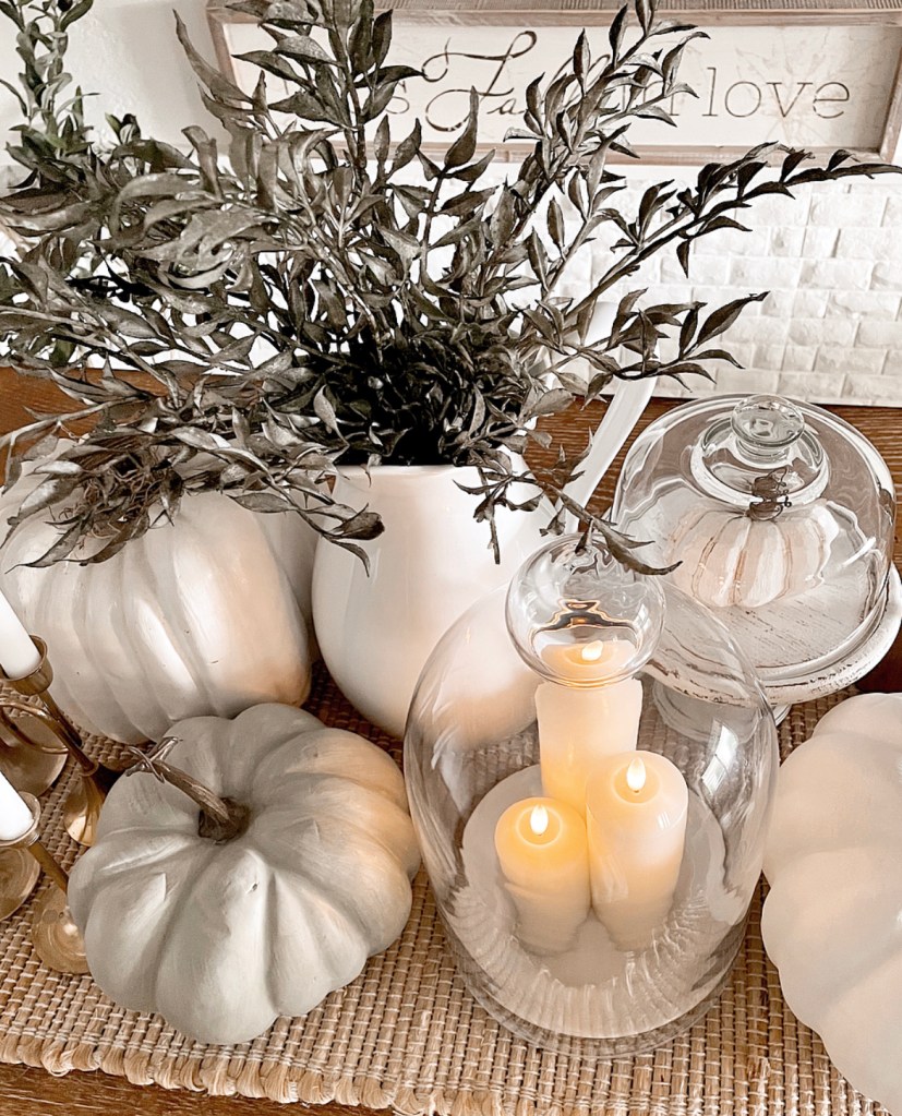 And here’s a little secret…if you don’t like the color of the pumpkins you have, paint them. I painted both of the white ones seen above.They’re super easy to paint and it instantly transforms them. There is just something about white pumpkins that speaks to me. Also, I get asked a lot about the cute candles under the glass cloche. They are battery operated and have a timer. You can find them here https://amzn.to/2WdTa0t