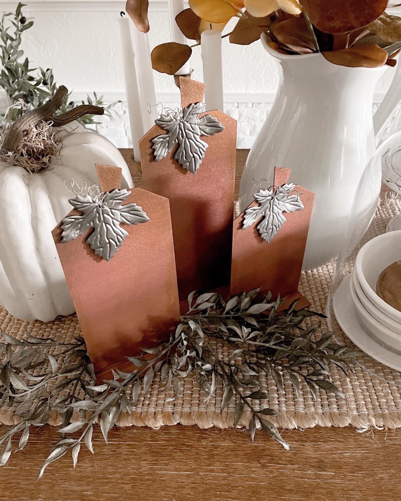 Hey friends. We’ve had crazy weather here with rain and cooler temps and then it went right back to being too hot. And with the crazy change in weather always comes the seasonal head cold/allergies. At least it does for me. I felt a little groggy today and actually took a nap. Which is strange for me because I never take naps. But I woke feeling much better. And even played around with a Fall table centerpiece. I love this time of year and decorating for Fall. Especially when I get some super cute happy mail. A local shop here in Utah called Just Joy Shop sent me these darling copper pumpkins and I was so excited to create a vignette with them on my dining table.