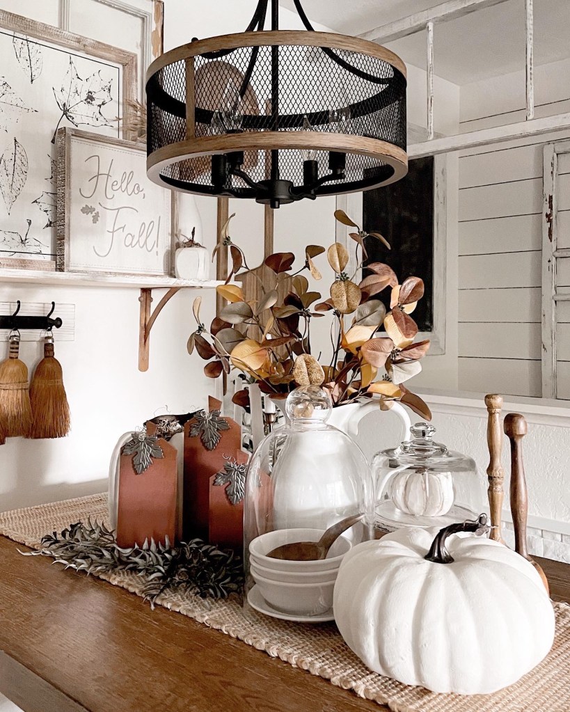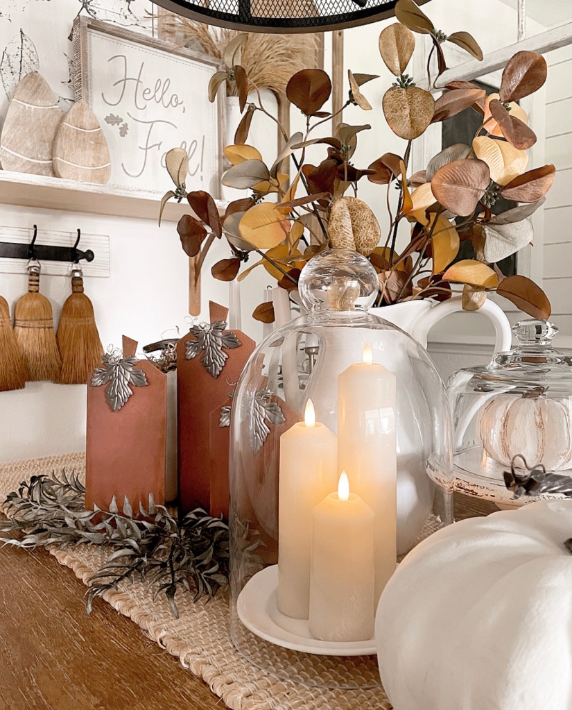 I played around with a couple different looks in here. Do you prefer the candles under the glass cloche or the small bowls? I think I love the candles most of all. They add a pretty glow and make the space feel warm and welcoming. The white pumpkins were hand painted by me. It was such a fun and easy DIY. Those are my kind of projects. Quick, easy and cheap.