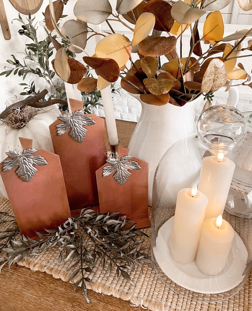 Aren’t they adorable? They are the perfect addition to my table. I love the copper color and the varying heights. When creating a vignette the different heights are an important detail to keep in mind. When I style my table I like to create a focal point that draws people in but then add texture and layers to hold interest. And of course keeping the colors flowing smoothly throughout the space helps to bring the whole room together. Because our table is in our kitchen it’s important to me to keep the theme cohesive throughout the entire room.