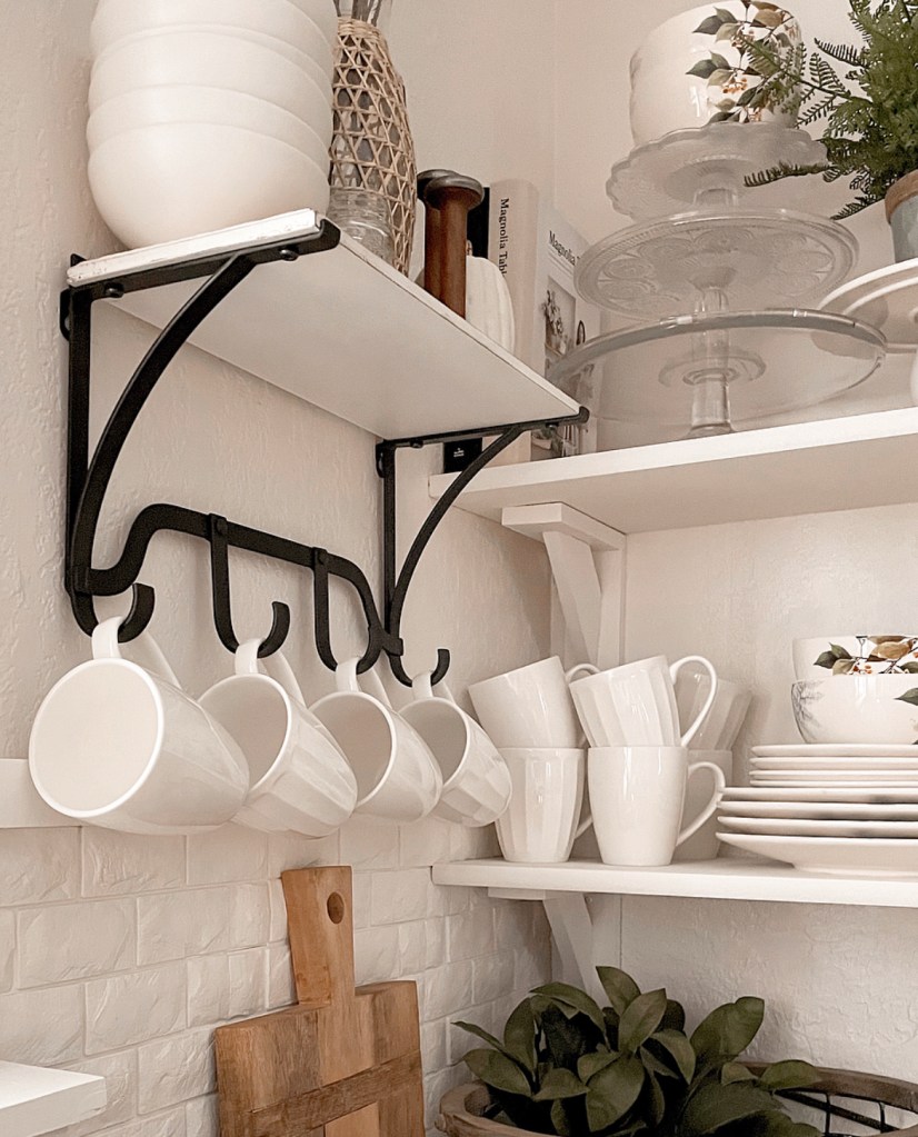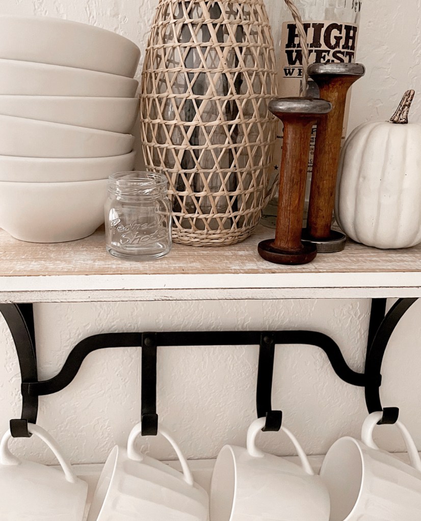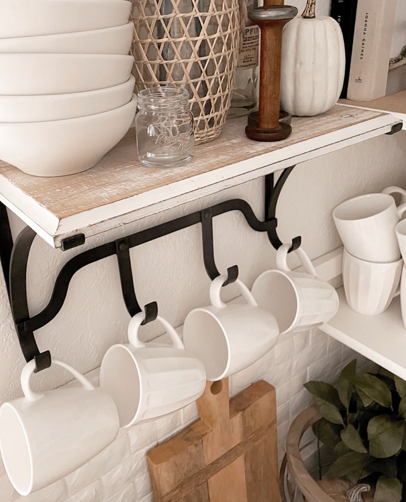 This shelf proved to be the perfect piece for this corner. I needed the extra space for coffee mugs and the hooks are perfect. And who couldn’t use another shelf to style? Y’all know how much I love shelves.