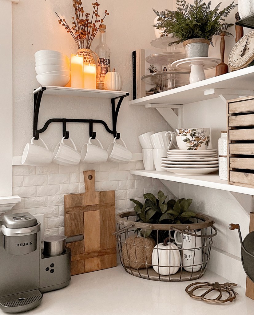 Hey friends! Welcome to a new week. And to the last day of August. Can you believe it? It’s time for the “ber” months. SeptemBER, OctoBER, NovemBER and DecemBER. All the months filled with my favorites. Fall, Halloween, Thanksgiving and Christmas. I’ve been adding Fall touches around my home for a couple of weeks now. And today I spruced up my little coffee corner in my kitchen with a few Fall items and a new shelf with hooks. Do you have a designated coffee station in your home or just on the counter like mine? I’ve always thought it would be fun to have a specific area to set up a coffee bar but we just don’t have the room in our small kitchen. But I do love how my little coffee corner has come together.