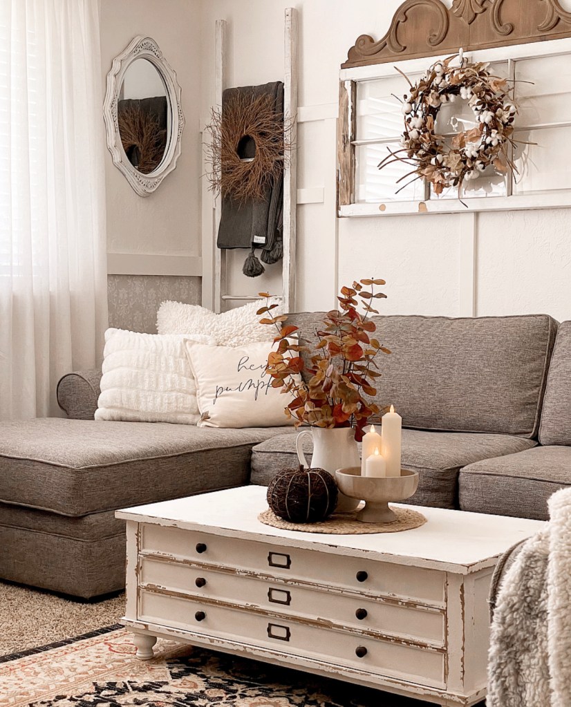 On my window gallery wall I just added some simple Fall touches. The wreath is from Ballard Designs. The architectural piece above the window and the coffee table are from Decor Steals. I made the blanket ladder. The Hey Pumpkin pillow is from PCB Home.