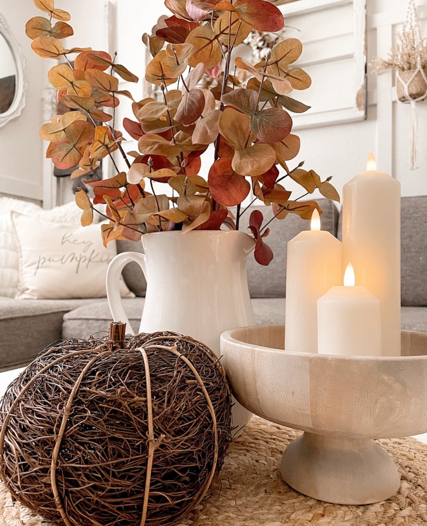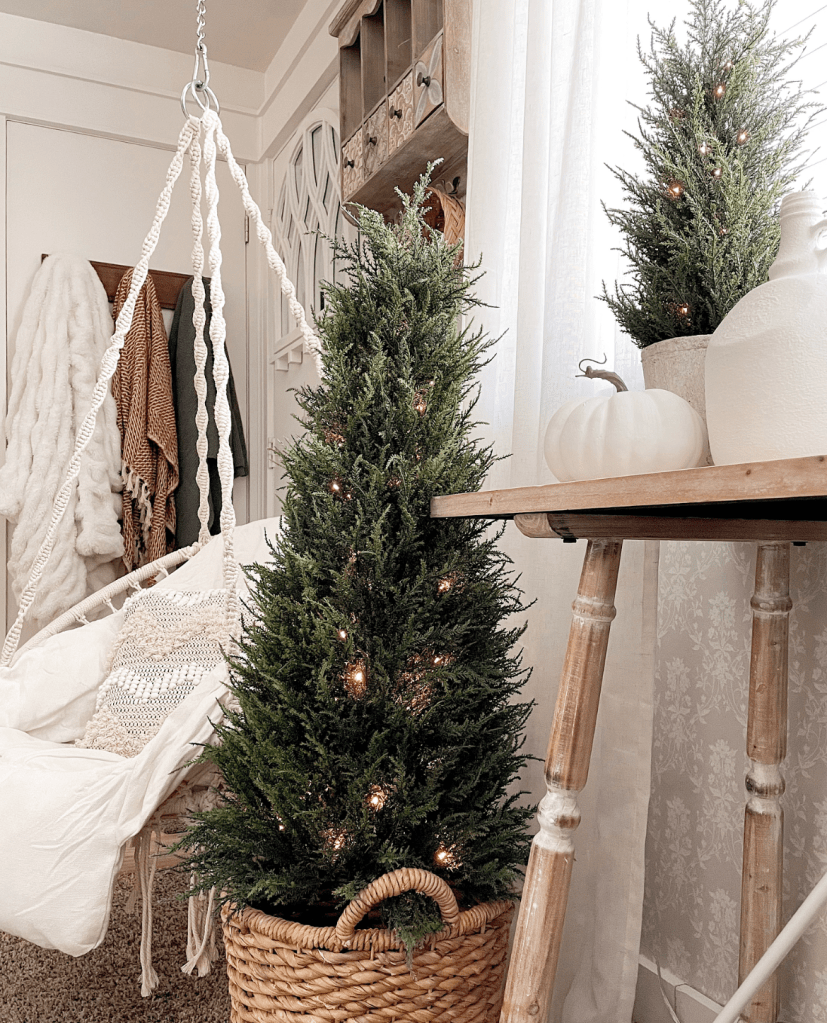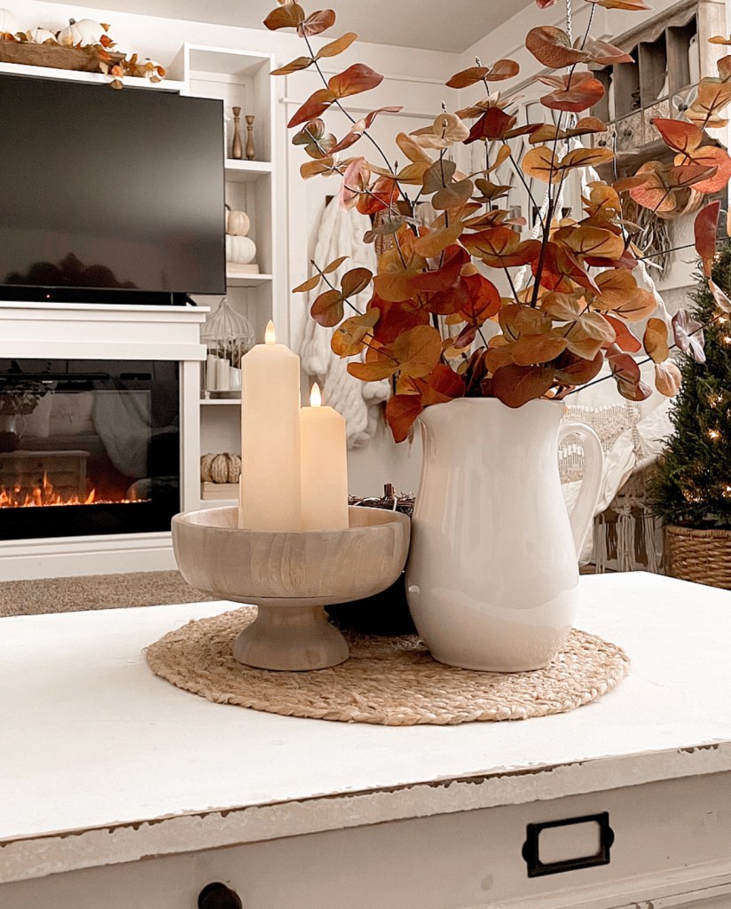 I wanted a cozy, warm vibe. So I used lots of texture, layers, candles and twinkly lights. I added a couple of cedar trees from Nearly Natural that are pre-lit. I love that they look amazing with my Fall decor and will transition so well into the upcoming holidays. And besides who doesn’t love twinkle lights? I’m a fan of them year round.