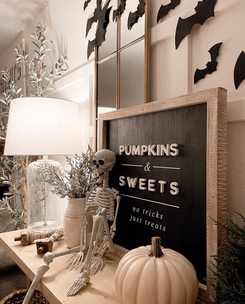 I found a printable on Pinterest for the book covers and just covered some old books I had laying around. For my other console table I added bats from Grandin Road and a sign from Krumpets Home Decor and of course another skeleton.