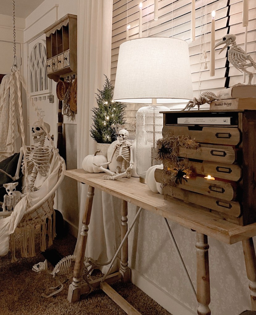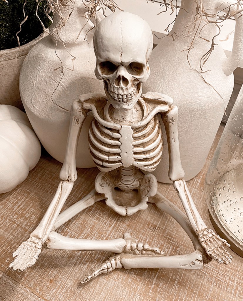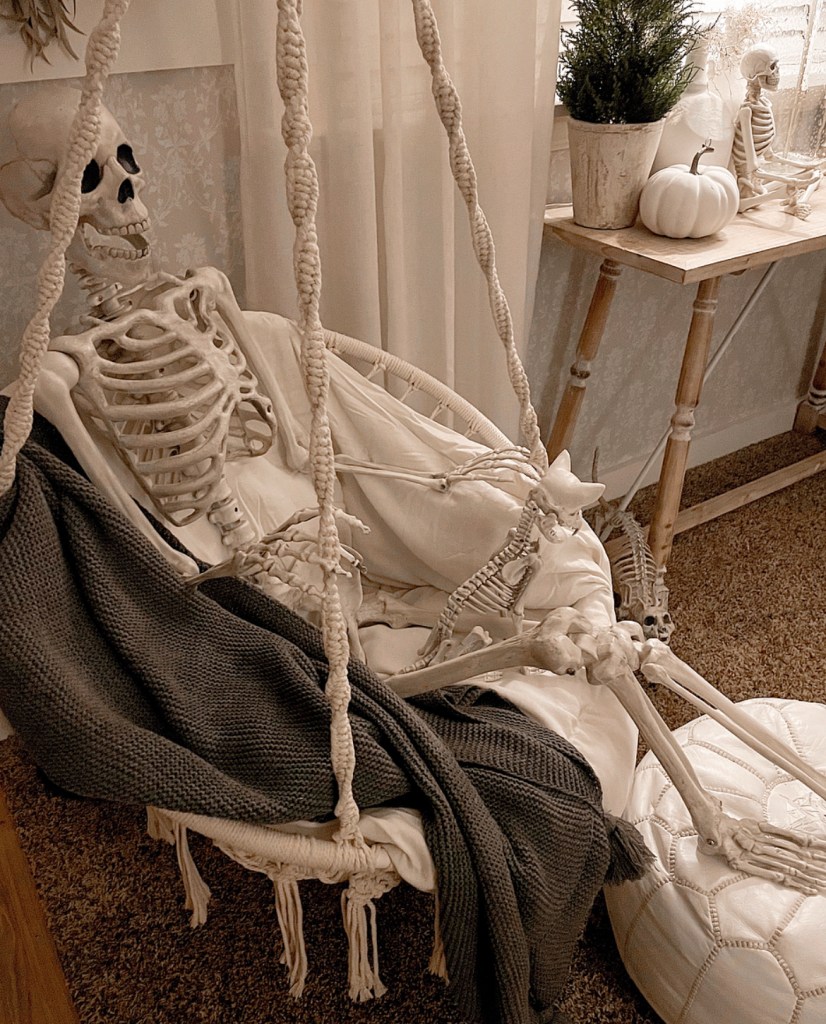 Hello friends! I can’t believe it’s already October and time for things to get spooky. Do you decorate for Halloween? I love getting my house spooky for Halloween while still keeping with a neutral decor palette. Your Halloween decor doesn’t have to be over the top scary or tacky. It’s so fun to incorporate different elements and textures into your home for this fun holiday. Of course I truly believe you need skeletons, lots of skeletons. They’re neutral, fun to pose around the house and are just the right amount of scary. We love bringing out our big skeleton every year. You never know what kind of shenanigans Mr. Skellington is going to get into. Today he’s chilling out in my hanging chair.