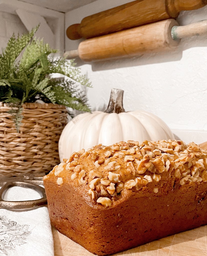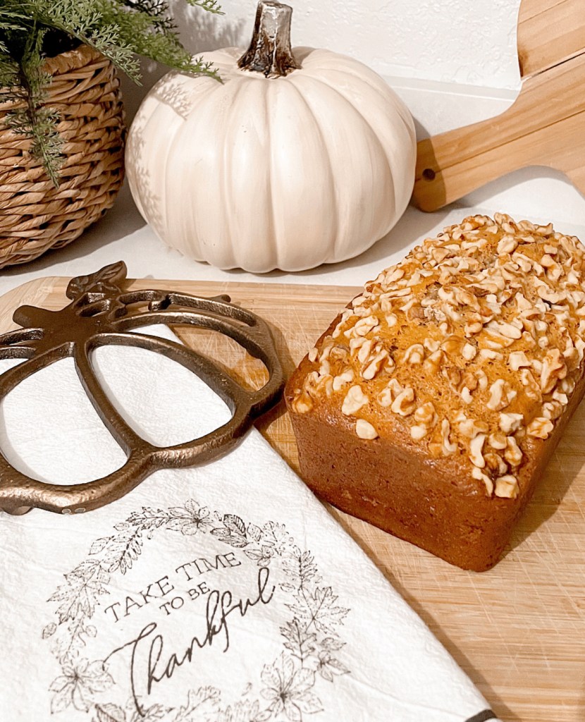 We are entering baking season. With all the holidays coming up this is the perfect recipe to make for neighbors or just something to whip up on a rainy day. Those are the days I enjoy baking the most. When it’s cold and wet outside, there is just something cozy about staying in and baking a delicious treat. So, happy baking my friends! And if you stumble upon a super good pumpkin loaf recipe, please share!