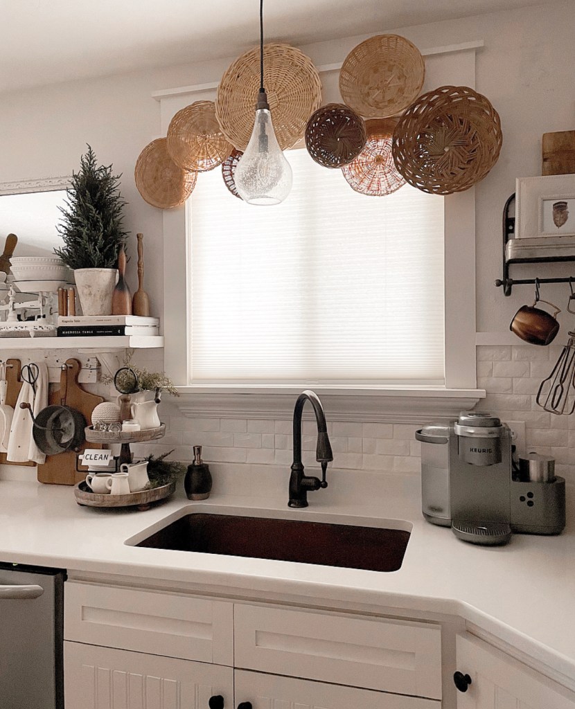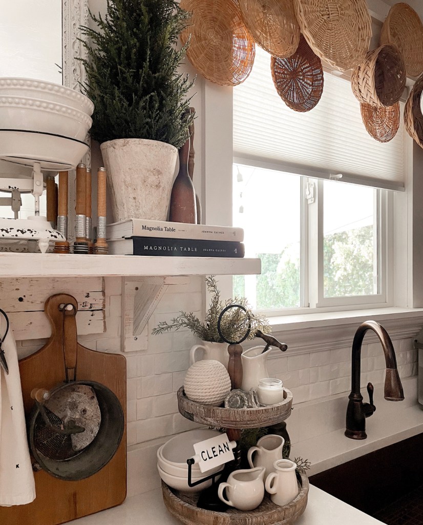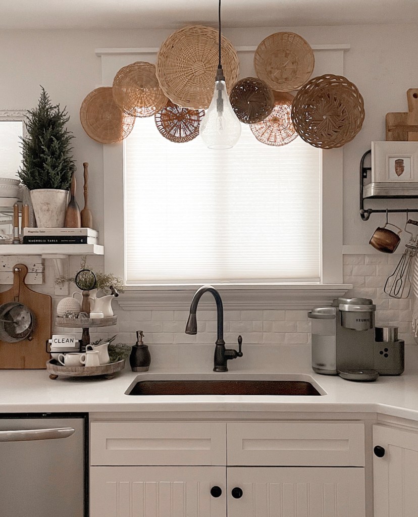 Today for Friday Farmhouse Favorites I wanted to share one of my favorite things to decorate with, baskets. And more specifically, basket walls. I’ve done a few different basket walls in my house. From above my bed to layered on window frames. But my newest basket display might just be my favorite and definitely my most unique. Layered above my kitchen window. This window just needed something and I thought, why not? I had all the baskets and decided to make a basket valance.