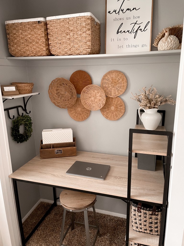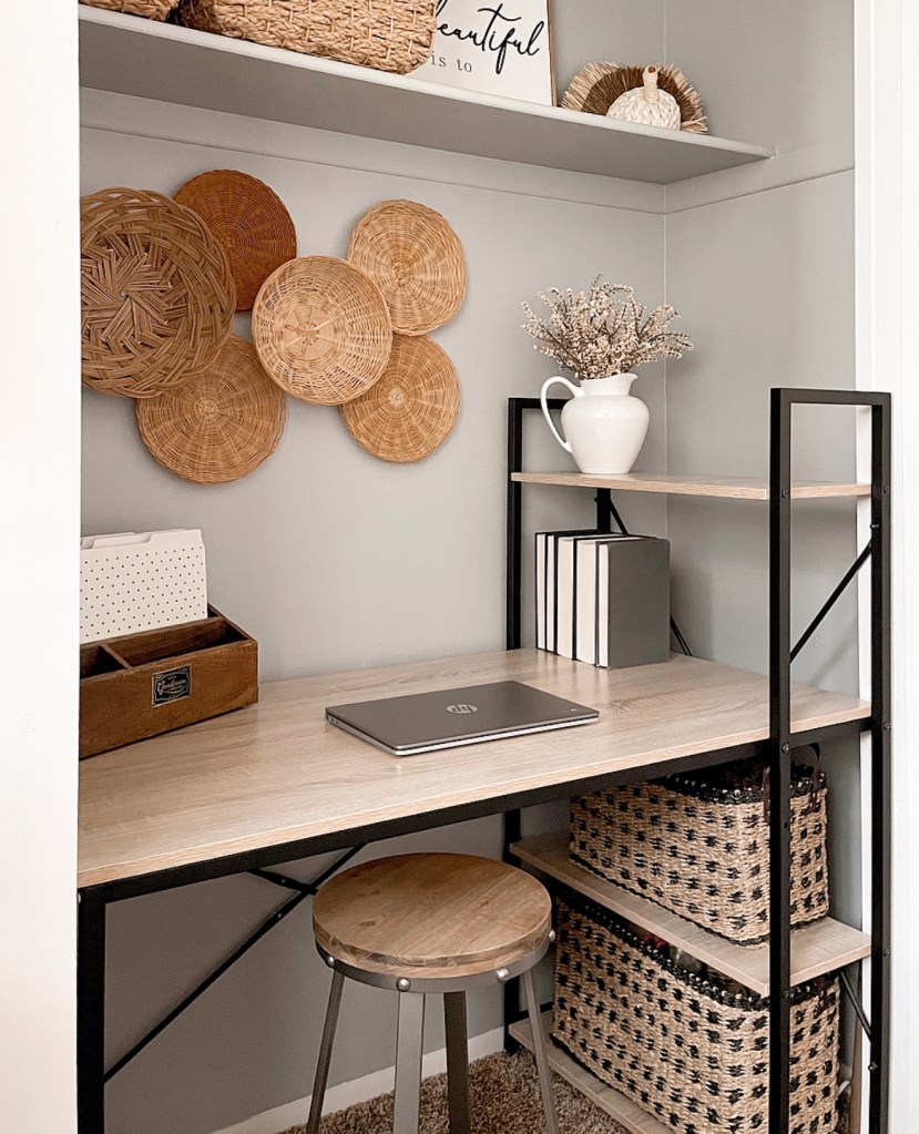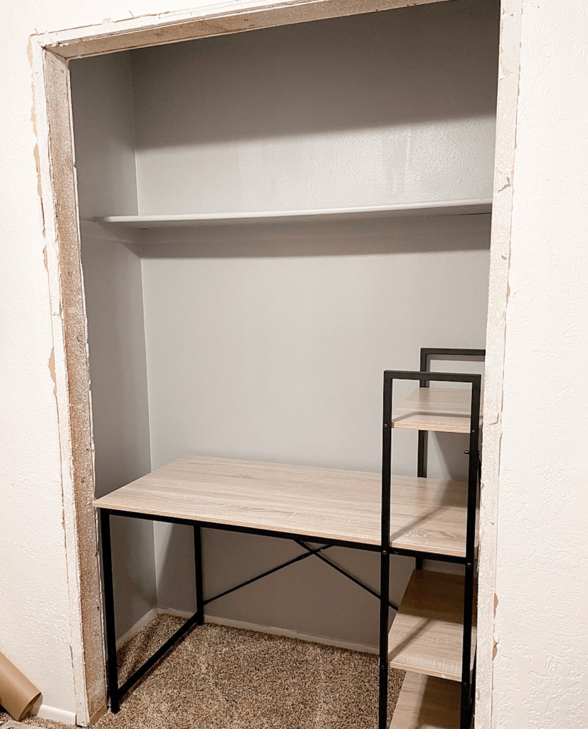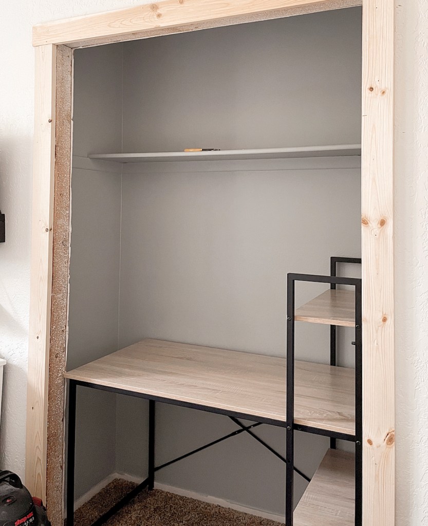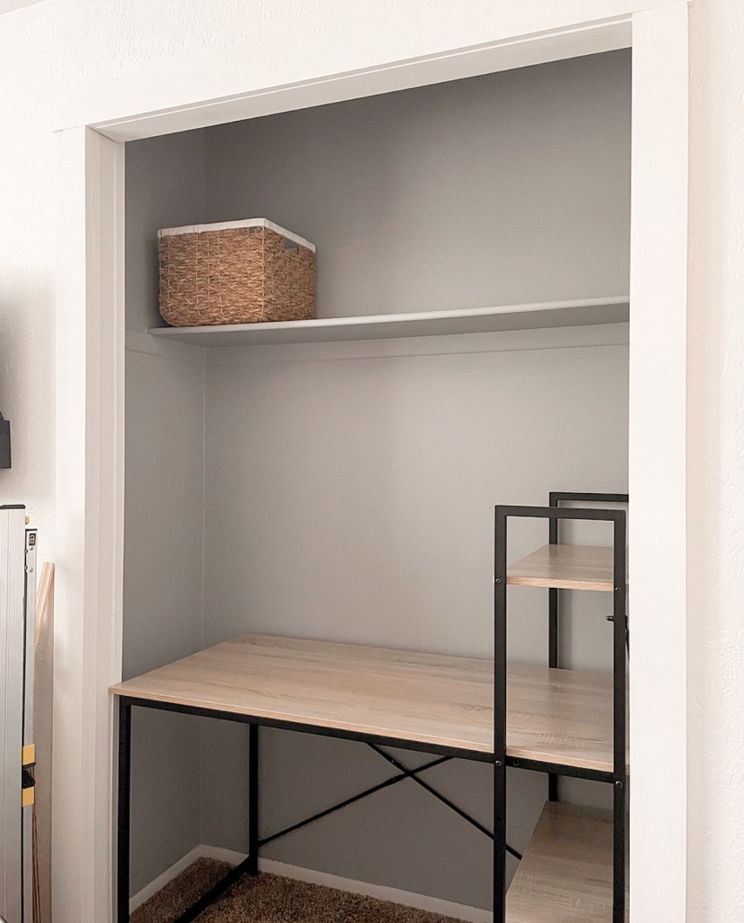 Pretty plain and in desperate need of paint. I had a couple cans of paint in my basement. One was dark gray and the other was off white. I mixed the two together and got a medium shade of gray. I painted the whole inside of the closet and added new trim around the opening. I painted the trim Antique White from Glidden which is the color I have in my whole house. It is the most perfect creamy white. I got the desk from Bestier and put it in there just to make sure it was going to fit. To my surprise, it fits perfectly.