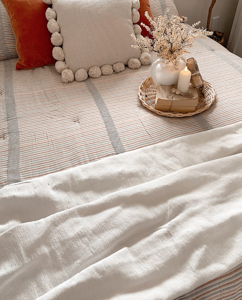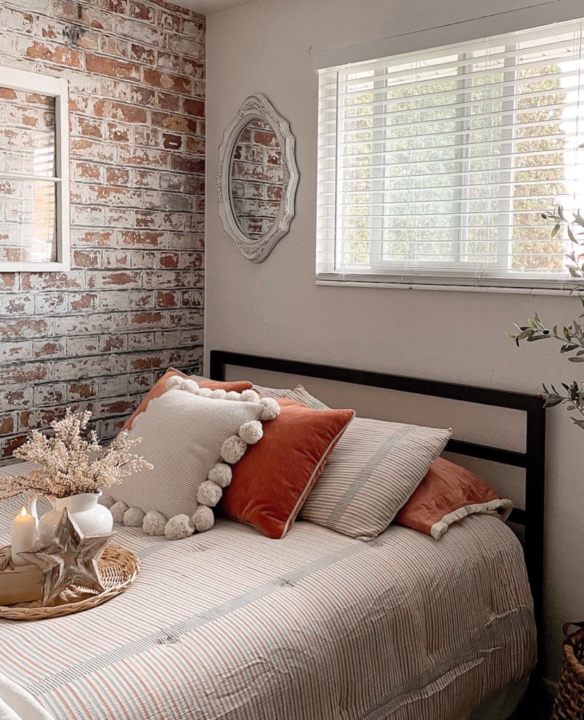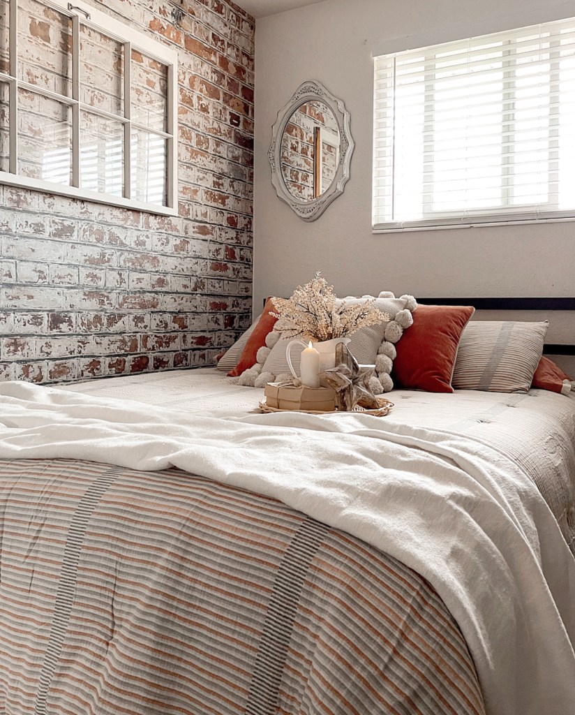 Happy Thursday! Can you believe Thanksgiving is in 2 weeks? This month is flying by. And with that I’m so excited to finally have our guest bedroom done. Which I’m also using as an office. I wanted this space to be both cozy and cute yet functional. I added a fun accent wall using peel and stick wallpaper from http://www.wunderwallmural.com. The one I used is the rustic brick wall. mural. I love the warmth it adds to this space. The bedding is from the Opalhouse collection at Target.