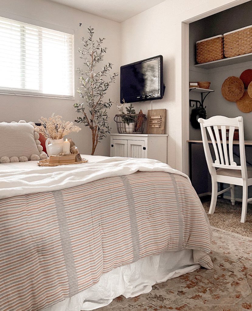 This room used to be a bedroom for my niece and nephew that had bunk beds in it and a lot of toys. But they don’t sleep over quite as much as they used to so we decided that having a guest room would work out better. Plus they can still sleep in this bed when they do come for a sleepover. And I used underbed storage bins from Amazon https://amzn.to/3CajgB5 to store their toys and they are also perfect for storing extra bedding.